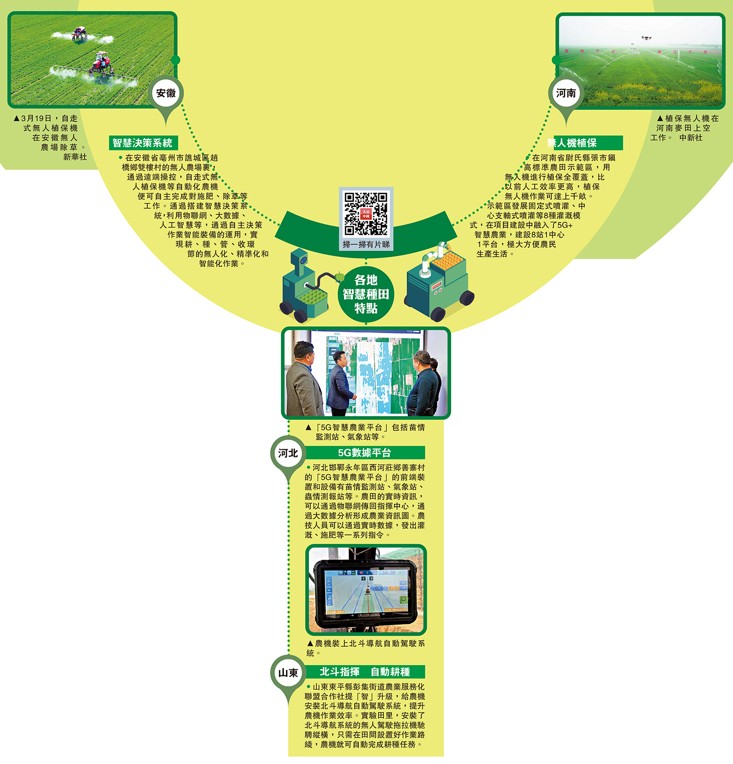 •在安徽省亳州市譙城區趙橋鄉雙樓村的無人農場裏,通過遠端操控,自走式無人植保機等自動化農機便可自主完成對施肥、除草等工作。通過搭建智慧決策系統,利用物聯網、大數據、人工智慧等,通過自主決策作業智能裝備的運用,實現耕、種、管、收環節的無人化、精準化和智能化作業。