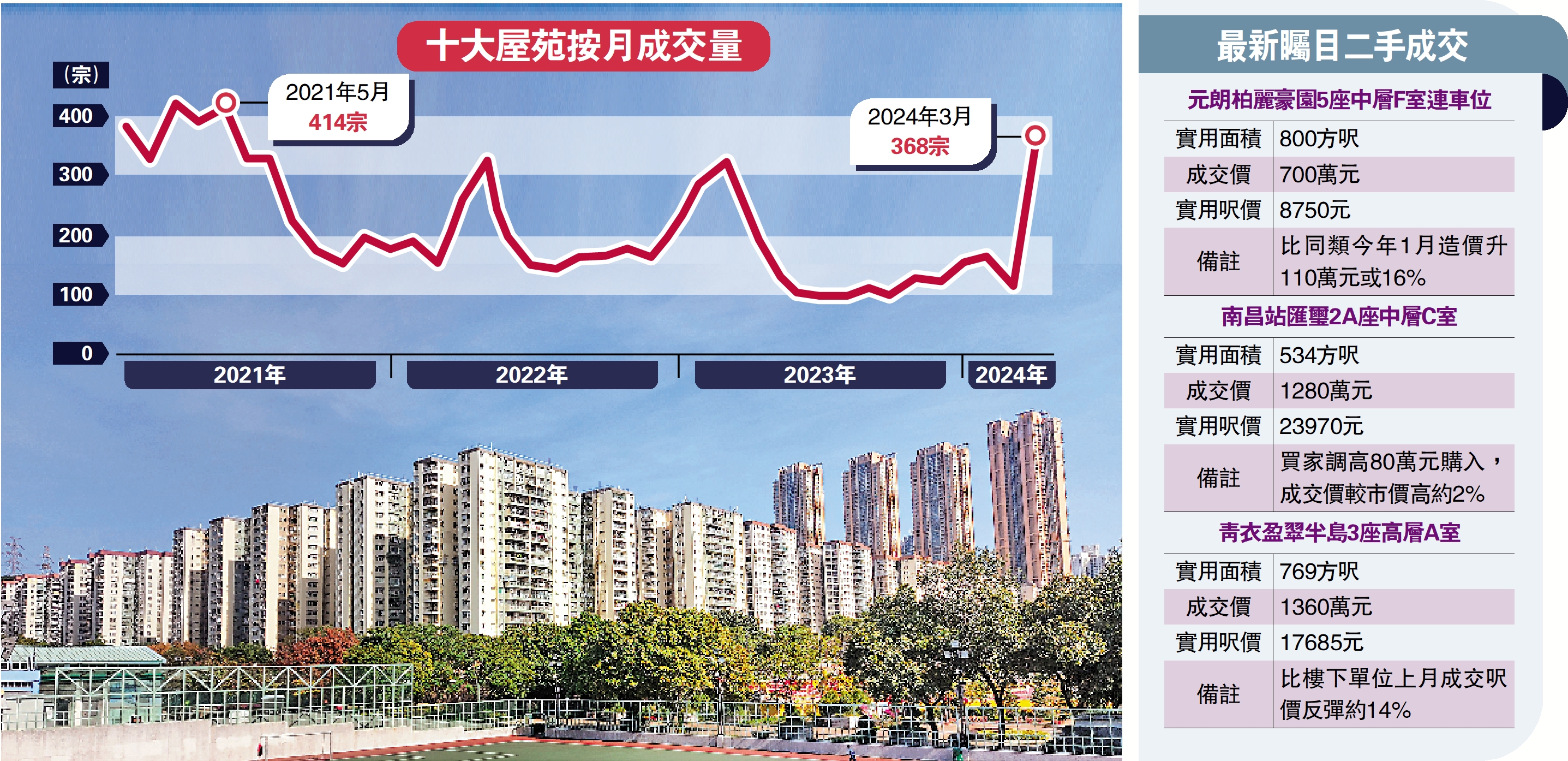 樓市撤辣釋放購買力,各區二手買賣爆升,十大屋苑3月成交量達368宗,創2021年5月後的近3年新高,多達7個屋苑平均呎價回升,其中天水圍嘉湖山莊呎價按月飆12%。指標屋苑造價大反彈,青衣盈翠半島套三房海景戶重上1360萬元,不足一個月漲價約14%。\大公報記者 林惠芳