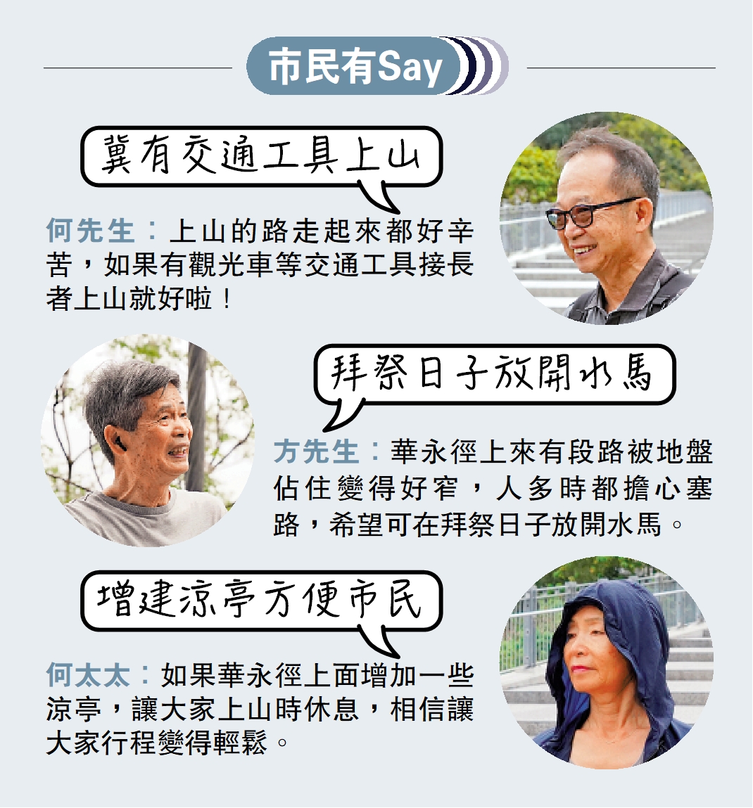 何太太:如果華永徑上面增加一些涼亭,讓大家上山時休息,相信讓大家行程變得輕鬆。
