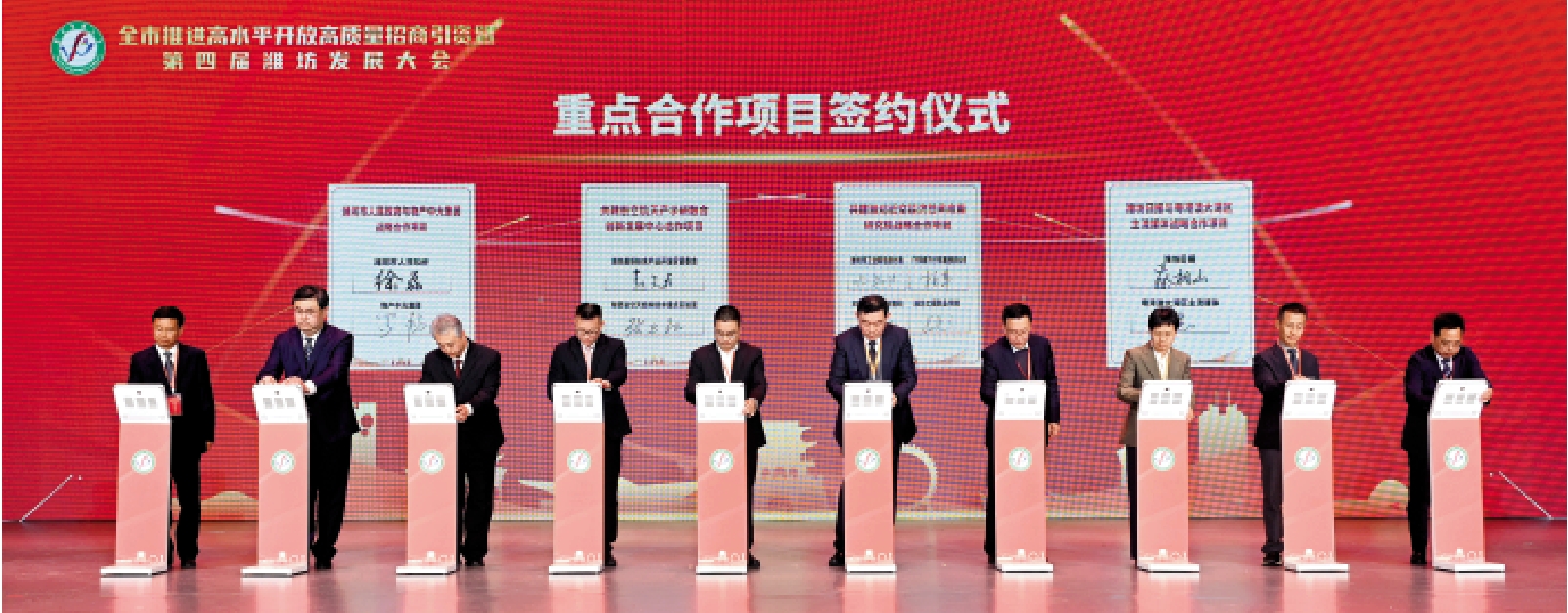 第四屆濰坊發展大會為期三天,多名兩院院士、高層次人才、高等院校和科研院所負責人、企業家代表以及海外知名人士齊聚風箏之都共話未來。當日舉行的主題大會上,山東(濰坊)華僑開放發展試驗區正式揭牌,濰坊市政府與上海交通大學、山東大學等雙一流高校簽署合作協議,山東大學和濰坊學院校際合作、濰坊日報社與粵港澳大灣區媒體戰略合作、濰坊市政府與物產中大集團戰略合作及共建航空航天產學研融合創新發展中心等重點項目集中簽約。大會期間還將舉行高端人才交流對接會、「綠色低碳高質量發展」「元宇宙產業發展」「跨境電子商務」「濰商匯能助力家鄉高質量發展」等多項活動。 據了解,2018年首屆濰坊發展大會以來,已促成1300多名濰商返鄉創業,達成項目200多個,涉及資金超過1000億元,引進國內外院士、專家學者、科研人員等256人,引進院士工作站、科研院所等92個,實現了政治效益、經濟效益和社會效益的有機統一。