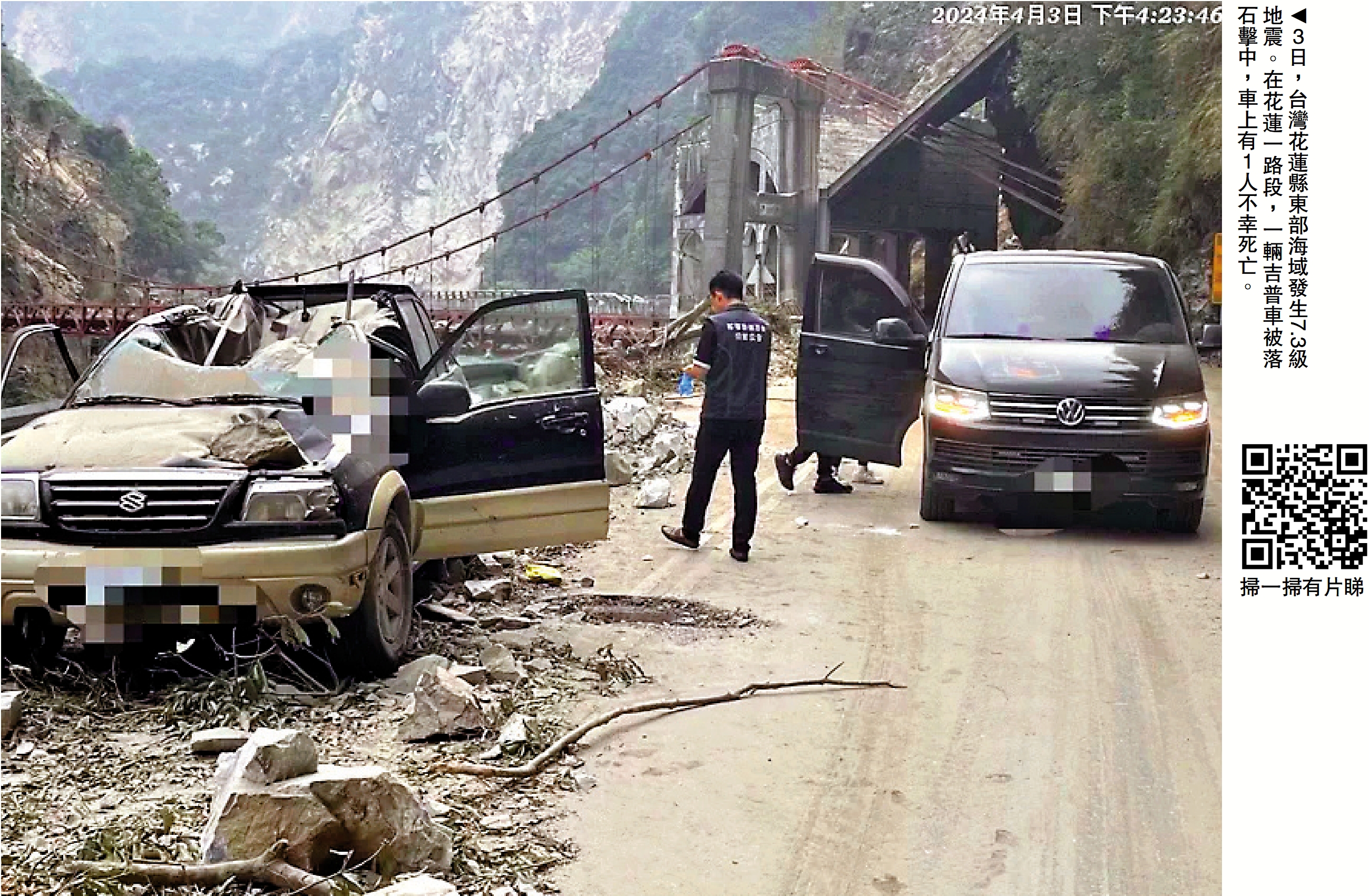 4月3日7時58分,台灣花蓮縣東部海域發生7.3級地震,震源深度12千米,隨後監測到多起餘震。台灣地震專家﹑台灣氣象部門地震測報中心前主任郭鎧紋表示,這次地震等同於32顆原子彈爆炸的威力。截至當日22時已造成9人死亡,1011人受傷。台灣地區氣象部門表示,未來三天可能還會有規模達7級的地震發生。