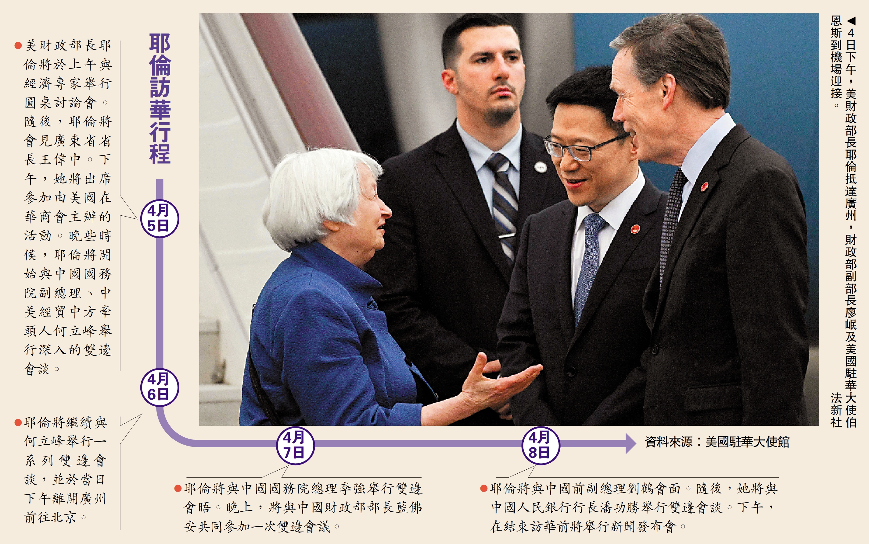 中國財政部新聞辦公室4月3日表示,經中美雙方商定,美財政部長珍妮特·耶倫於4月4日至9日訪華。4日下午,耶倫抵達廣州,開啟為期六天的訪華行程,財政部副部長廖岷到場迎接。這是耶倫不到一年時間裏第二度訪華。據美國財政部公布,耶倫此訪將同中方官員、經濟學家和在華美國商界主要代表等人士會晤,5日將開始與國務院副總理何立峰舉行深入雙邊會談。中國外交部發言人汪文斌3日表示,中美經濟關係根植於兩國共同利益,本質是互利共贏,希望美方同中方相向而行,妥處分歧、凝聚共識、深化合作,推動中美經濟關係穩定向前發展。\大公報記者 葛沖北京報道