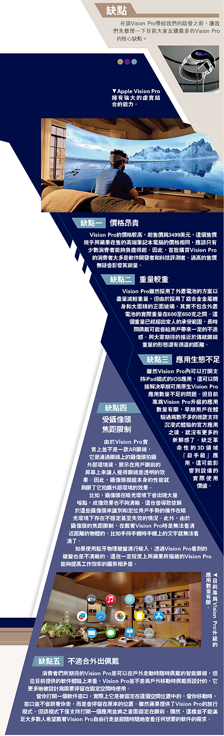 消費者們所期待的Vision Pro是可以在戶外走動時隨時佩戴的智能眼鏡,但從目前提供的軟件體驗上來看,Vision Pro並不是為戶外移動時佩戴而設計的,它更多地被設計為需要停留在固定空間時使用。