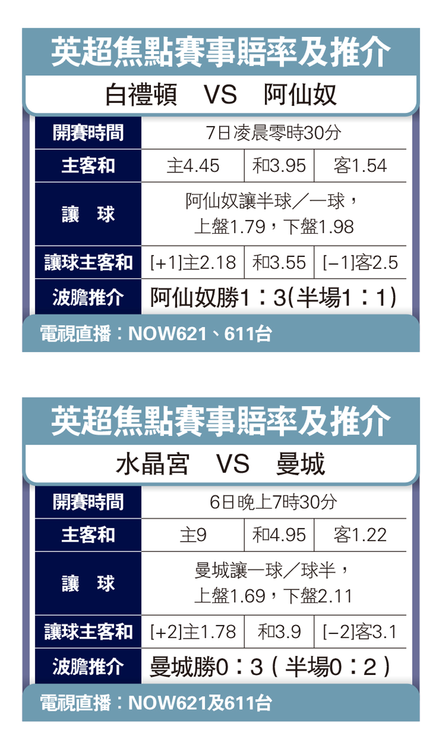 曼城就會在早場作客水晶宮。曼城上仗大破阿士東維拉4:1之役,同時收起了射手艾寧夏蘭特和中場靈魂奇雲迪布尼,但卻造就菲爾科頓大放異彩,預料3人將恢復聯合攻堅,而水晶宮入球能力欠佳,要在曼城身上「破蛋」亦不容易,不妨考慮買「波膽」曼城客勝的0:2和0:3。(NOW621及611台今晚7時30分直播)