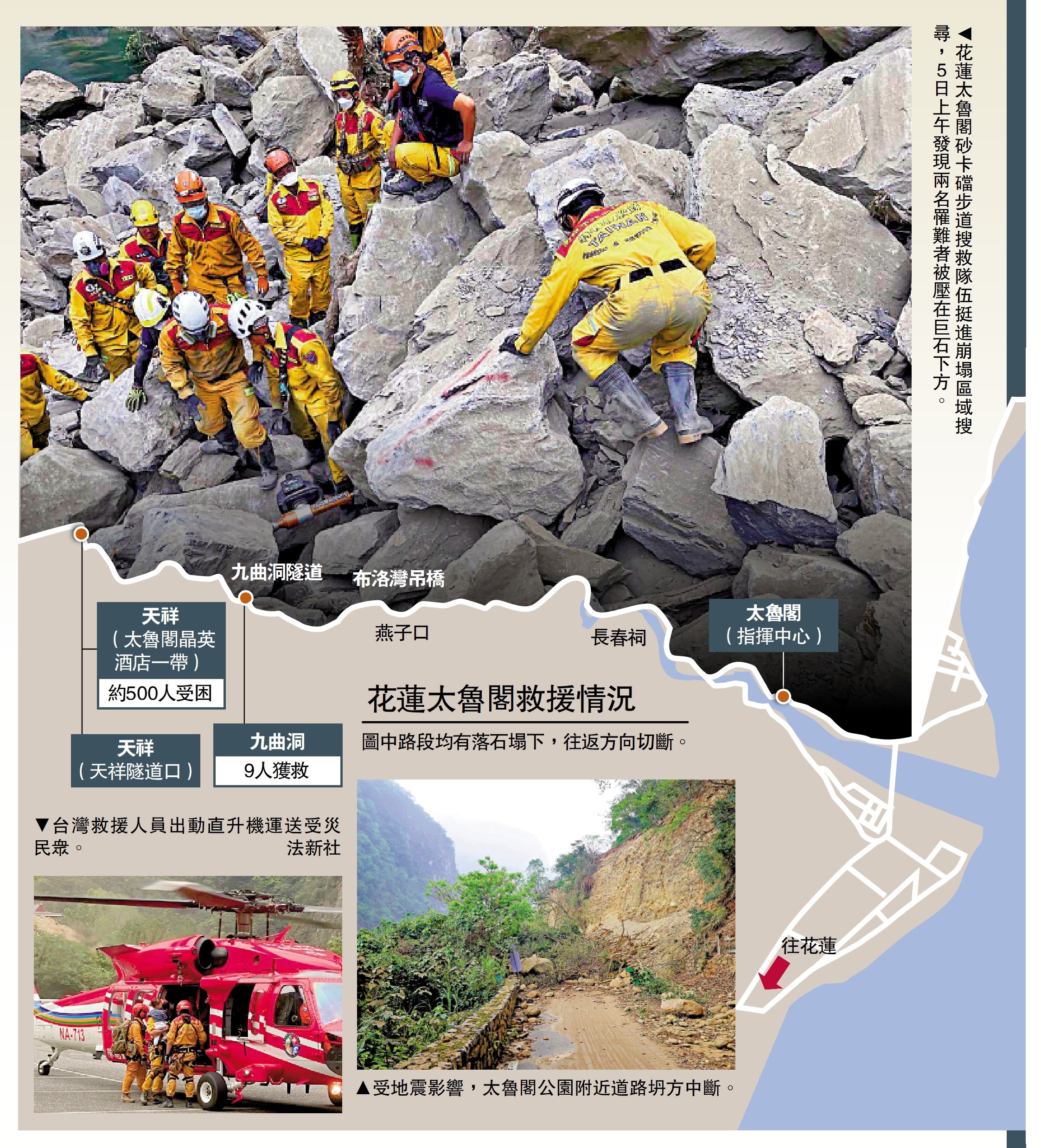 台灣花蓮3日發生7.3級地震,截至5日21時,造成12人遇難、1133人受傷、10人失聯。自3日起至今,花蓮及附近地區共出現535次餘震,5日凌晨最強的一次達到5.3級。由於餘震不斷,影響救災安全及進度。受困人士主要集中在太魯閣晶英酒店的天祥周邊地區,台消防部門特種搜救隊當地5日早上出動直升機搭載物資及6名搜救人員前往支援,截至5日18時已從太魯閣救出80多人,其中四人來自香港。至5日16時,估計仍有約500人受困於晶英酒店和天祥活動中心一帶。香港入境處連日來已接獲34名港人求助,其中11人身處花蓮太魯閣地區。