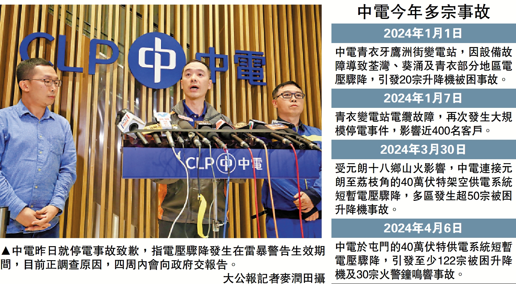 【大公報訊】記者陸九如報道:中電位於屯門的40萬伏特供電系統昨日下午錄得短暫電壓驟降,引發逾120宗被困升降機及30宗火警鐘鳴響事故,影響九龍及新界多區。中電發言人稱,此次事故初步懷疑由發生在龍鼓灘發電廠內的設備故障引起,其間電力供應沒有中斷。特區政府十分關注近期數宗同類事故,要求中電盡快查明事故成因,在4星期內就事故提交詳細報告,並採取有效措施作出改善。