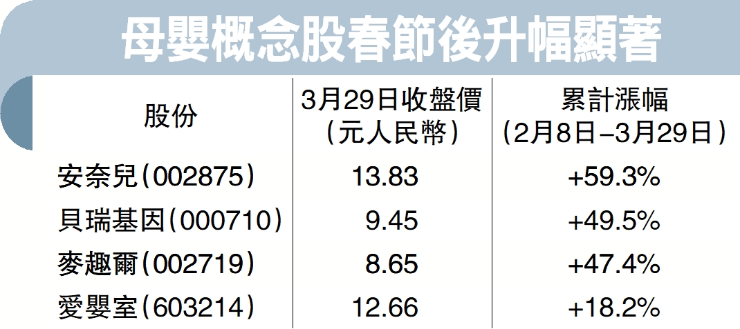 今年春節假期過後,個別母嬰概念股也出現顯著升幅(見附表)。其中,聚焦生育健康、遺傳病檢測、科技服務、腫瘤檢測等領域的貝瑞基因,3月下旬股價曾高見13.16元,與春節假期前收盤價比較升逾1倍。以乳製品生產業務和烘焙食品的連鎖經營業務為核心的麥趣爾,期內股價最高升至9.04元,較春節假期前收盤價升54%。
