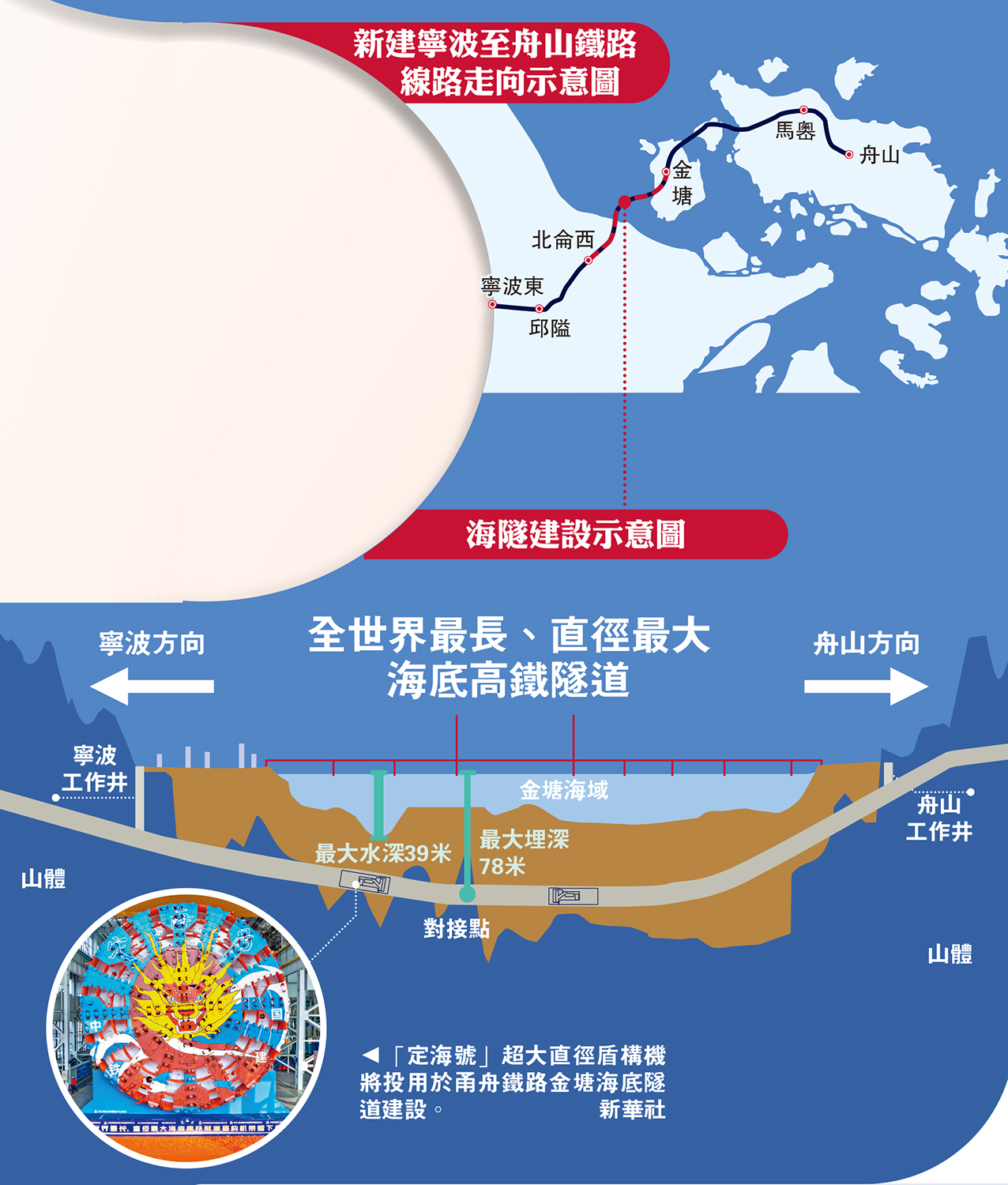 圖:新建寧波至舟山鐵路線路走向示意圖、海隧建設示意圖