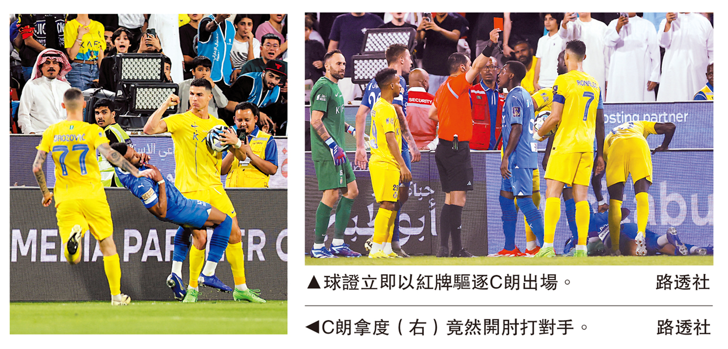 【大公報訊】據ESPN FC報道:葡萄牙球星C朗拿度於昨晨的沙特超級盃準決賽,末段因向對手「打肘」而領獲加盟艾納斯後首面紅牌,球隊亦負於希拉爾而出局;C朗的前皇家馬德里隊友賓施馬卻有不同命運,射入是項賽事史上最快入球,最終亦助伊蒂哈德擊退艾華達,周四晚將與希拉爾爭標。