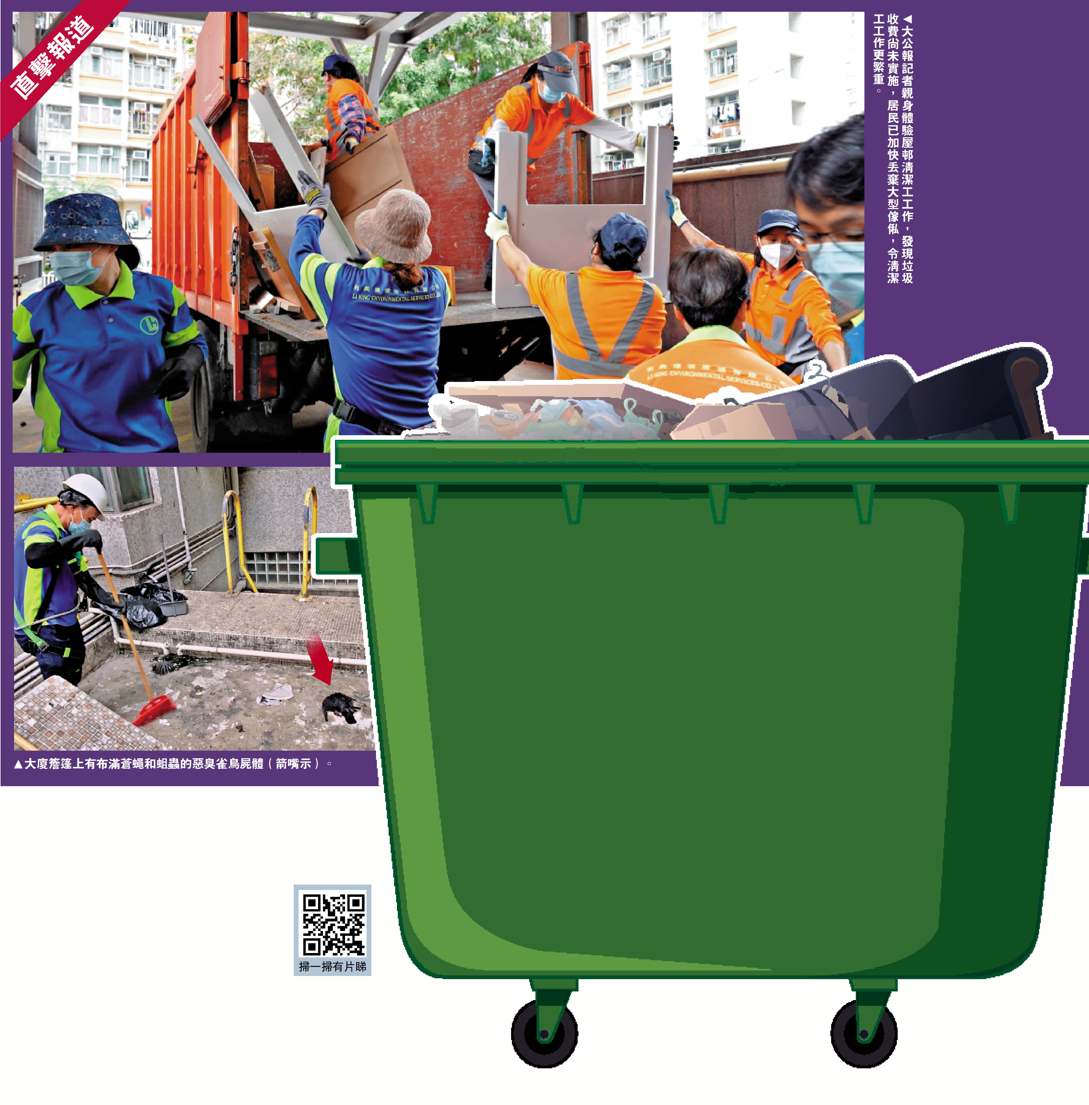 清潔工友祥哥說:「用咗指定袋,街坊就會將回收廢物、廚餘分開丟,我哋『倒樓』(上樓倒垃圾)都要分兩次,變相做多一倍,勞損都快多一倍!」有業界工會希望政府改善外判制度,增加工友人手及待遇,長遠增設基金補助,保障工友因工勞損而影響生計的殘酷現實。\大公報記者 葉浩源(文) 許棹傑(圖、視頻)