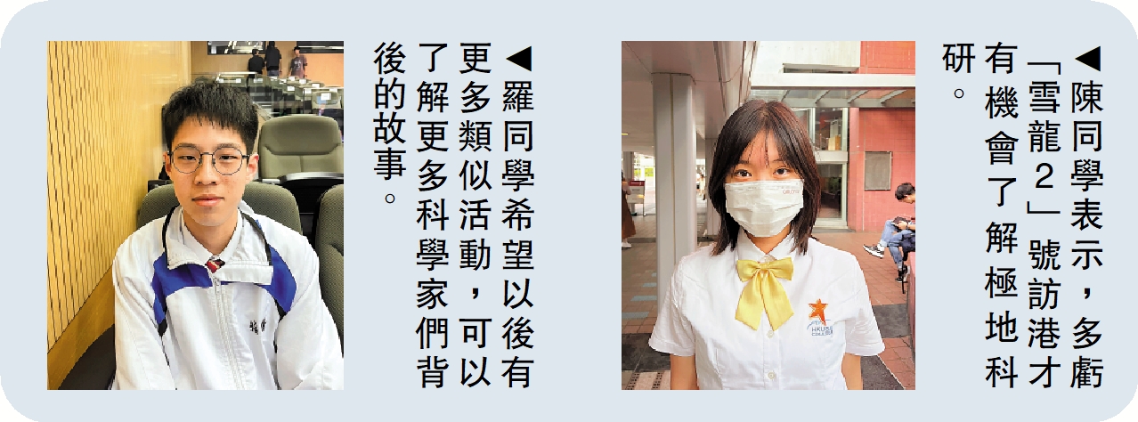 就讀中一的羅同學則認為,專家們分享在極地工作活動的部分讓他印象深刻。「我以前認為極地環境嚴酷寒冷,人們生活會非常艱難,但現在科技發展了,令我驚訝的是他們在『中山站』的活動非常多、非常有趣。」