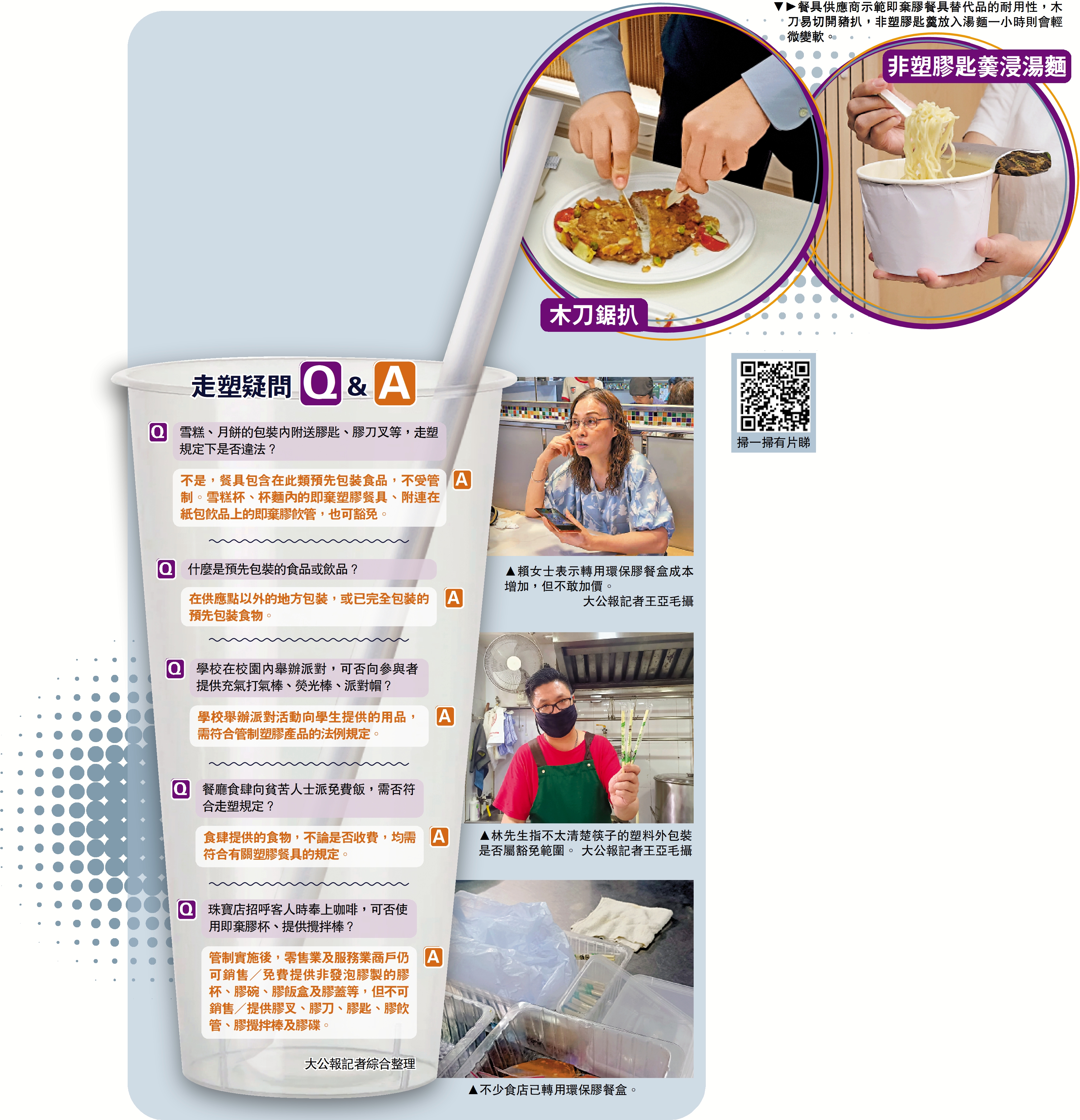 大公報記者昨日現場直擊市面食肆的應對情況,有食肆表示已轉用環保膠餐盒,但成本價格是以前的兩倍,而且未找到匙羹的合適供應商,擔心加價趕走食客,也擔心沿用的竹筷子的包裝膠袋會否違規。環保署表示,業界將有六個月的適應期,期間不會對違規業務執法。\大公報記者 王亞毛 劉碩源