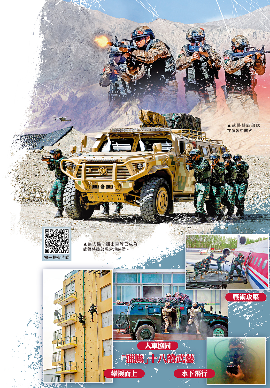 武警部隊「獵鷹」、「雪豹」、「山鷹」三大特戰突擊隊,是肩負反恐處突的特戰勁旅。而最早創立的「獵鷹突擊隊」更是精銳中的精銳,是一支陸海空三棲的特戰力量,每個隊員都經過嚴格的魔鬼訓練,千錘百煉,曾參與北京奧運會、G20峰會、香港回歸20周年、世界互聯網大會等許多重大活動安保任務。在諸多智能化、無人化裝備的加持下,「獵鷹」等武警特戰部隊的戰鬥力不斷躍升。\馬浩亮(文)