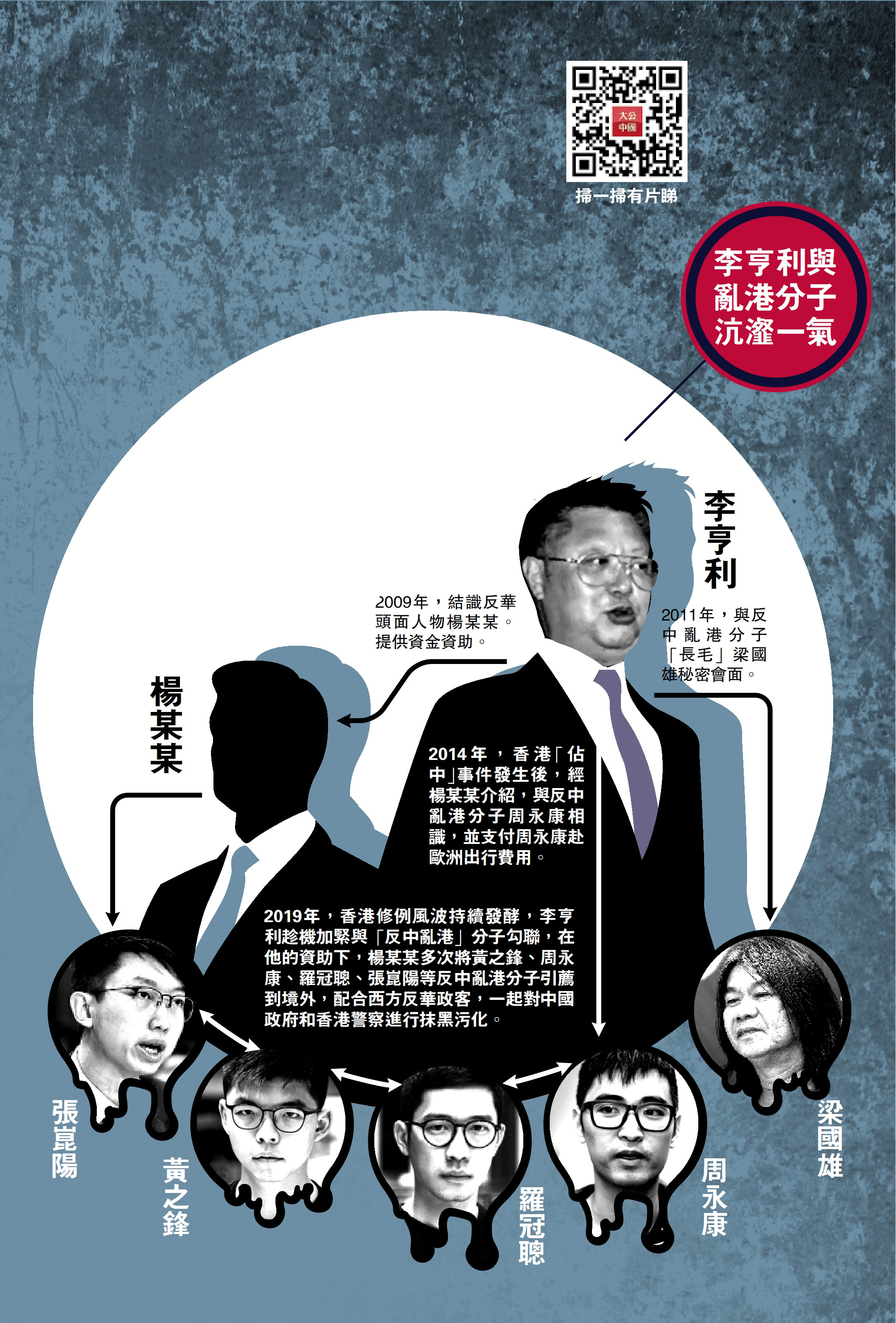 2014年,香港發生非法「佔中」事件,這讓他異常興奮,主動通過楊某某約見挑頭人物周永康,當即資助其前往歐洲參加反華活動和接受培訓。2019年香港修例風波持續發酵,李亨利趁機加緊與「反中亂港」分子勾連,傾其所有提供資金支持。在他的資助下,楊某某多次將黃之鋒、周永康、羅冠聰、張崑陽等「反中亂港」分子引薦到境外,配合西方反華政客一起對中國政府和香港警察進行抹黑污化。
