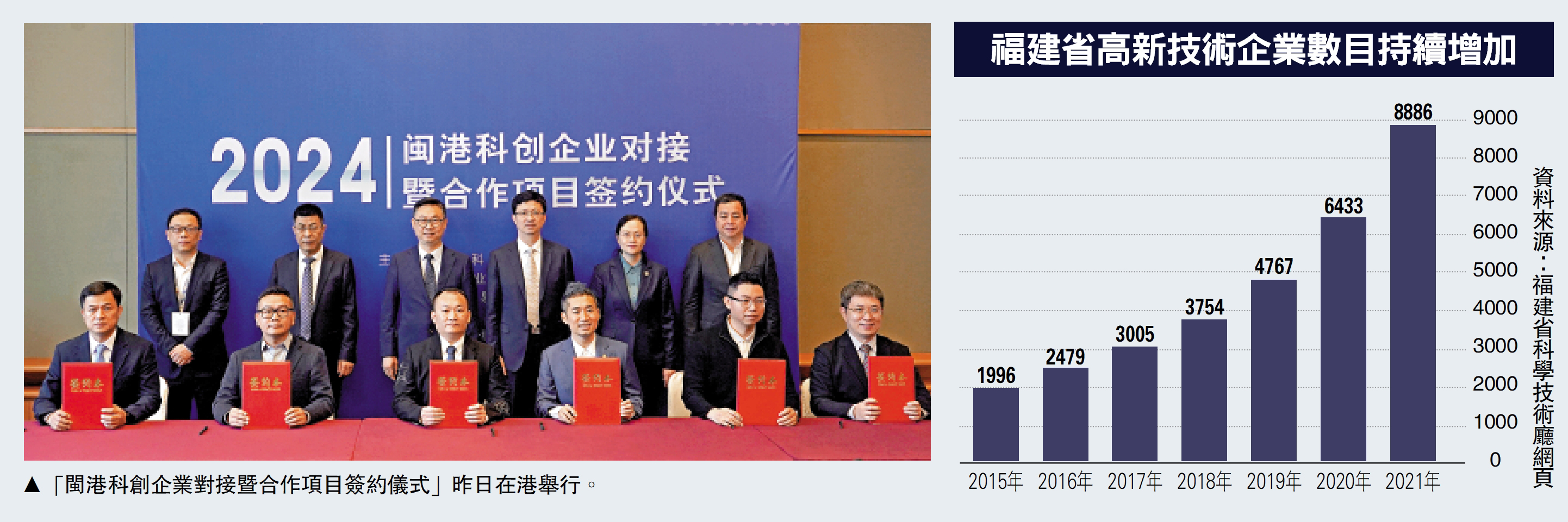 福建省科學技術廳廳長李志忠昨日(14日)在「閩港科創企業對接暨合作項目簽約儀式」上致辭說,按照福建省政府的工作安排,福建省科技廳首次組織參加香港國際創科展,設立了「福建科創館」,並聯同福建省工信廳和香港貿發局舉辦閩港科創企業對接座談合作項目簽約活動,總體想法就是充分借助香港國際創科展這個平台,共同推動閩港兩地科技創新合作,拓展合作機會、賦能閩港兩地高質量發展。