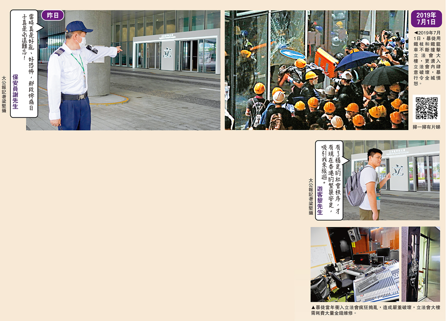 暴徒衝擊破壞立法會當日,保安員謝先生正在相鄰的政府總部上班,他告訴記者,對2019年7月1日發生在立法會的事件及所經歷的黑暴日子「永遠難忘」:「那時天天都有遊行示威,到處都有暴徒掟磚、掟燃燒彈,政府總部和立法會經常被這些暴徒包圍,路上交通更是經常被堵塞……」平時由元朗的家到政總上、下班,謝先生平時不足一小時的車程,當時經常要花上兩小時,多轉兩次車。「真好麻煩。當時真是好亂、好恐怖,那段慘痛的日子真是永遠難忘,所幸有了國安法後,香港才安定了下來」。