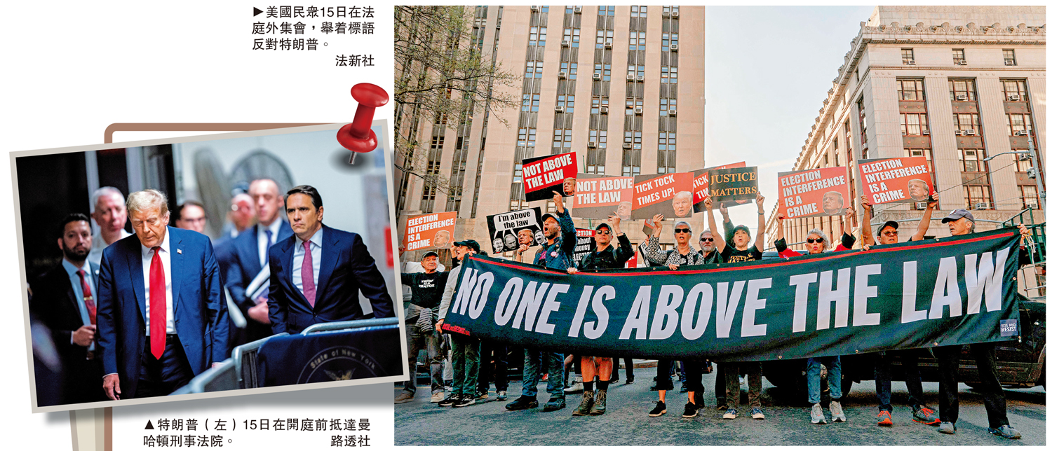 美國前總統特朗普15日現身紐約法院,就「封口費」刑事訴訟出庭,成為首位接受刑事審訊的美國前總統。法院於當日開始選出12人的陪審團,整個審訊過程料將持續6至8周。若特朗普此案被指控的34項罪名均被判成立,其將面臨最高20年監禁。雖然被定罪理論上不會阻止特朗普競選公職或任職總統,但仍將影響他的選情。