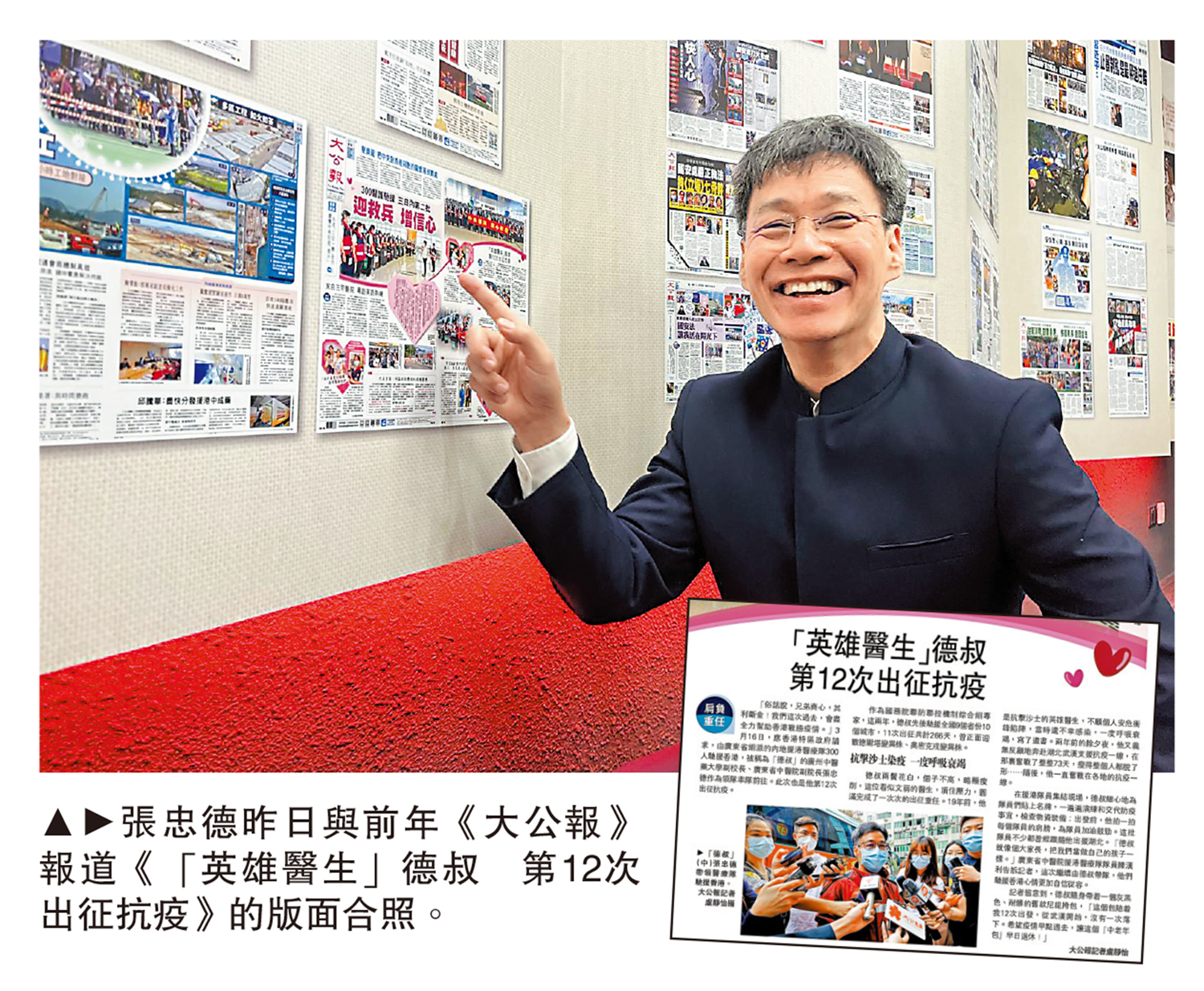 廣東省中醫院院長張忠德昨日參觀大公報報史館時,驚訝發現關於自己的報道,非常興奮。2022年3月17日《大公報》報道了當年疫情兇猛衝擊香港,內地援港醫療隊來港支援的情況,其中一篇特寫的標題是《「英雄醫生」德叔 第12次出征抗疫》。「原來『德叔』上了《大公報》的標題了,難怪香港的朋友都這樣叫我。」他笑着感謝《大公報》的報道,立即與版面上的「德叔」合照。