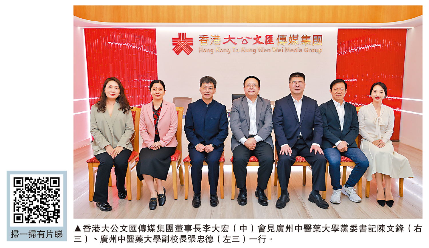 李大宏董事長介紹了《大公報》和《文匯報》的光榮歷史,以及當前整合資源、錯位發展、融合發展,大力提升傳播力和影響力的情況,並介紹了集團海外傳播平台、「媒體+政務商務服務」生態平台、青少年交流平台這三大平台的建設成效。陳文鋒書記、張忠德副校長對《大公報》和《文匯報》的悠久歷史及推動兩地融合發展作出的貢獻表示由衷敬佩,並感謝集團各媒體長期對廣州中醫藥大學和中醫藥發展的大力支持。