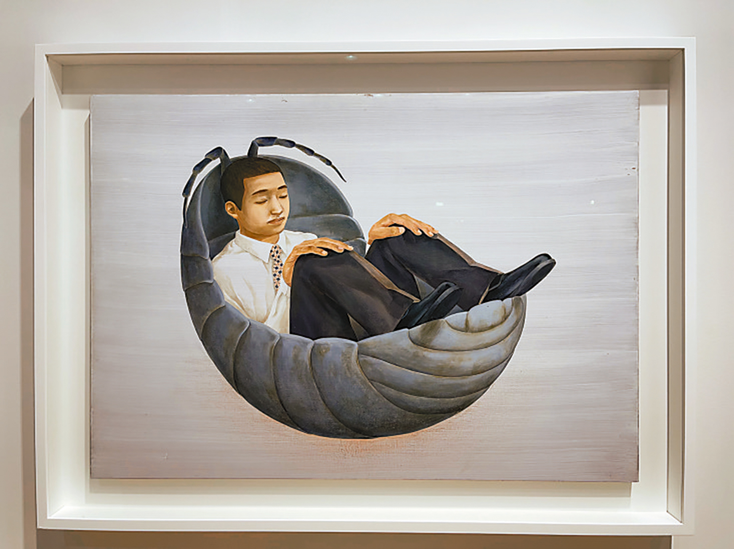 眼前的一位男性上班族把雙手規規矩矩地放在膝蓋上,雙眼緊閉,倒沒有明顯的疲態,也並非若有所思,應該說是整個人放空了,因為就姿勢來看,他亦不太可能平靜地入眠,他沒有躺在床上,而是坐卧在結草蟲的甲殼裏。這就是今年香港巴塞爾藝術展展出的藝術家石田徹也的畫作,題為《結草蟲的睡眠》(一九九五)。
