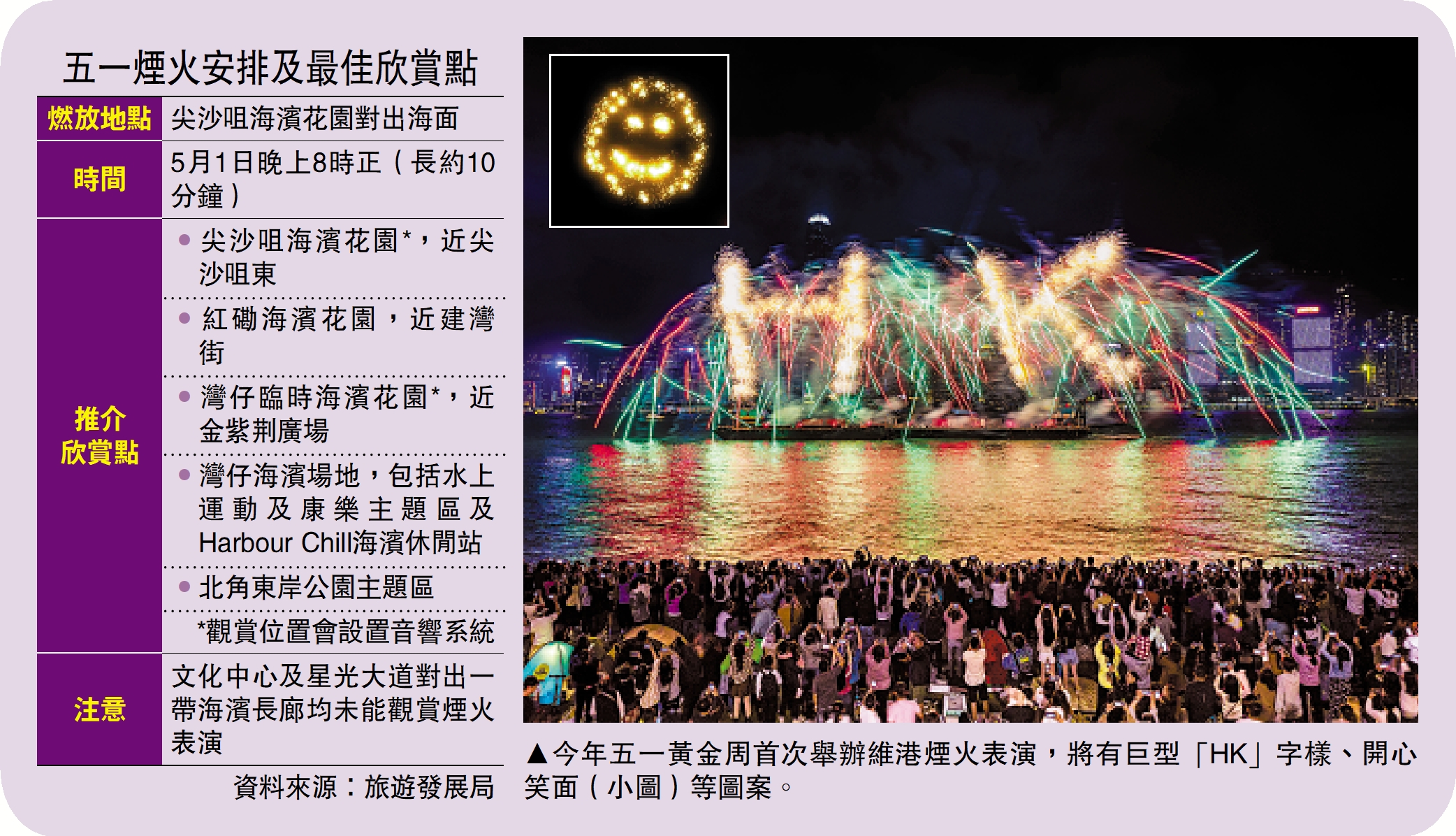 下周三迎來內地五一黃金周假期,政府預計將有約590萬人次在黃金周期間經各口岸進出香港,包括80萬內地旅客人次,旅遊業監管局預計有680個內地團來港。今年五一黃金周將首次舉辦維港煙火表演,旅遊發展局昨日公布,在尖沙咀海濱對開海面發放的10分鐘煙火,最高約100米,將有巨型「HK」字樣、開心笑臉等圖案,在對岸的灣仔海濱、北角東岸公園也可觀賞到煙火。