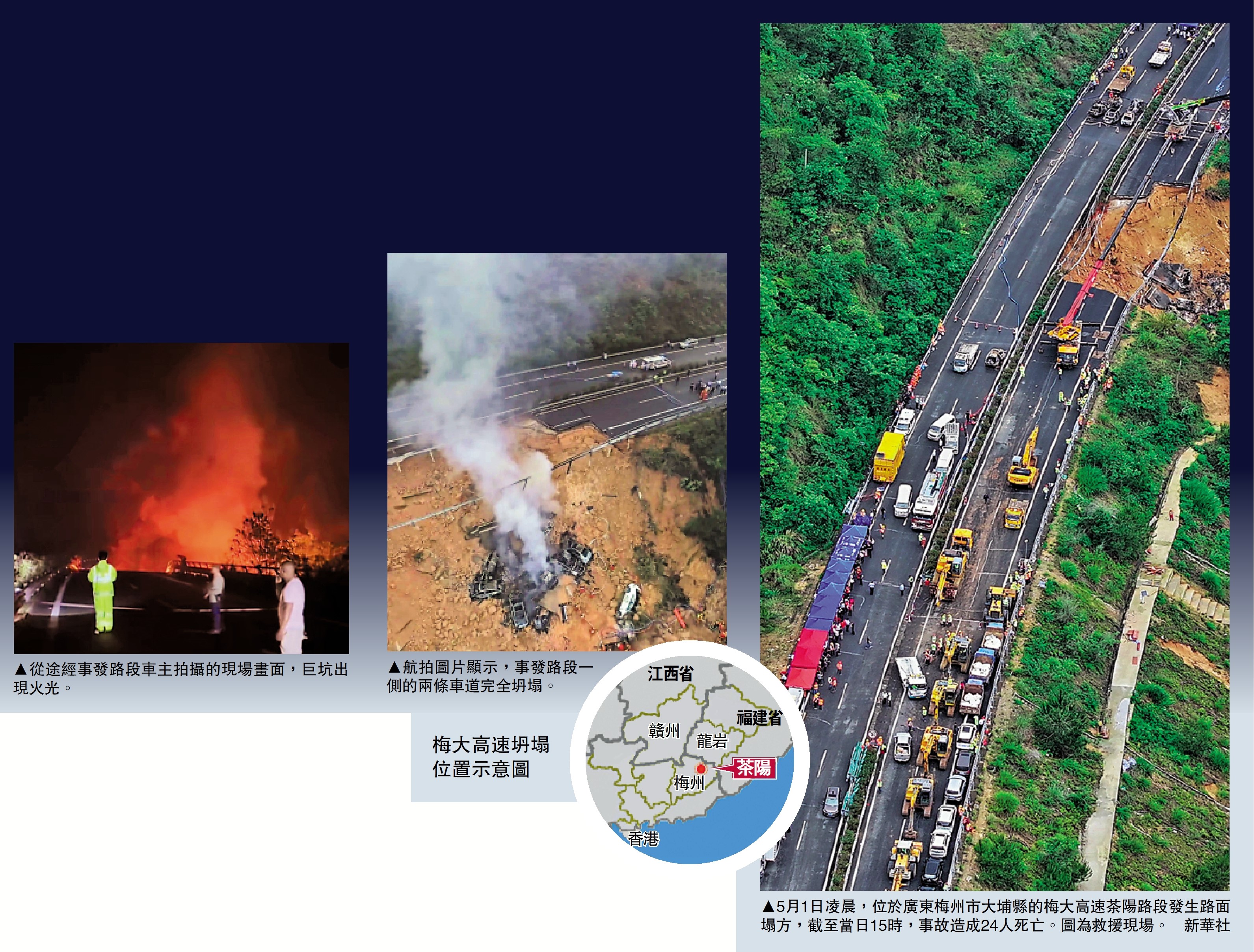 廣東多地1日遭遇強對流天氣,當日凌晨,位於廣東梅州市的梅大高速茶陽路段發生一處路面塌方,塌方路面長約17.9米,面積達184.3平方米。事發時,多輛汽車從高速墮入巨坑,其中還有汽車起火。有緊急掉頭的車輛將險情告知後方車輛,其中,來自河北的司機駕駛重型貨車抵達事故點後,聞訊後撤並不斷提醒後方車輛,重型貨車車身擋住後方車輛去路,避免事故進一步擴大。截至當日15時,事故造成24人死亡,30人受傷3留院救治,暫無生命危險。廣東省、市兩級全力開展救援,一度投入500人參與現場救援。\大公報記者 敖敏輝報道