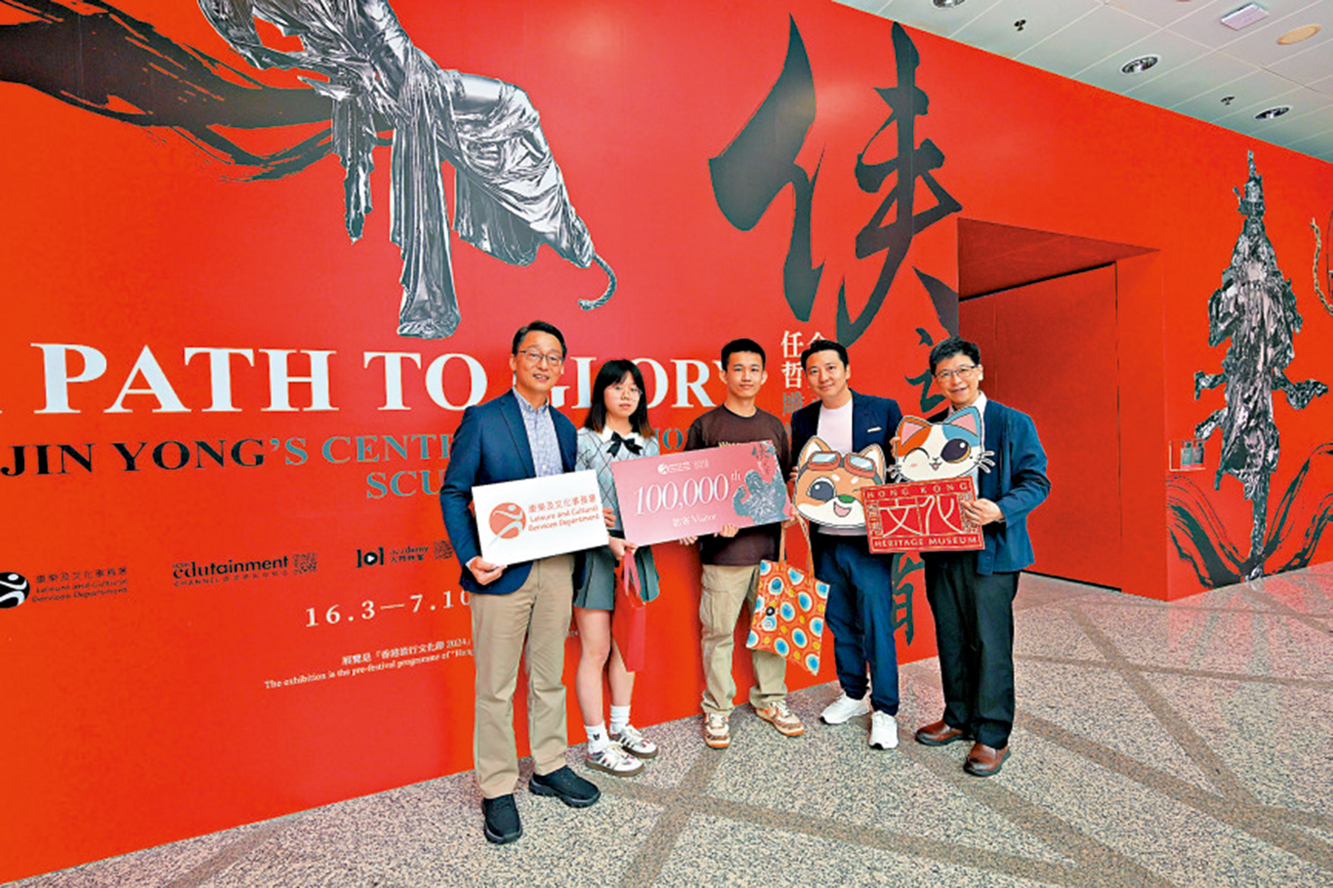 第十萬名入場觀眾是來自福建的郭先生和陳小姐,二人曾多次到訪香港文化博物館,去年也曾參觀博物館內的張國榮紀念展和李小龍展覽,今年又趁「五一黃金周」專程來港參觀「俠之大者」展覽。郭先生說,初中時看過由金庸小說改編的電影後,便愛上金庸的作品,他最喜歡的小說角色是《神鵰俠侶》中的楊過。