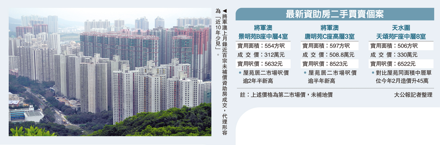 新一批白居二流入市場,加上房委會收緊公屋富戶政策,部分綠表客加快入市,帶動資助房買賣逆市飆升,其中將軍澳上月錄近百宗相關二手成交,按月漲1.4倍,代理形容為「近10年少見」。在僧多粥少的情況下,業界料資助房價量齊升局面持續。\大公報記者 林惠芳