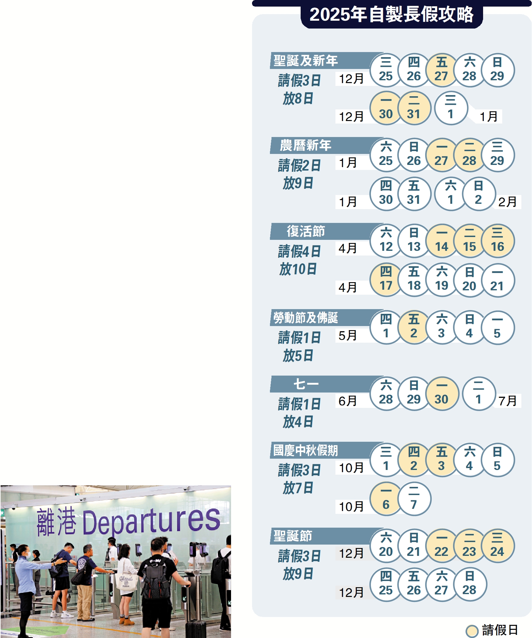 打工仔若要自製長假,第一個組合可以是今年聖誕與明年元旦的跨年長假組合,請3日放8日。今年聖誕節兩日假期是12月25日、26日,分別是周三、周四,打工仔可以在27日(周五)、30日(周一)及31日(周二)請假,就可以連同明年元旦,享受8日長假。