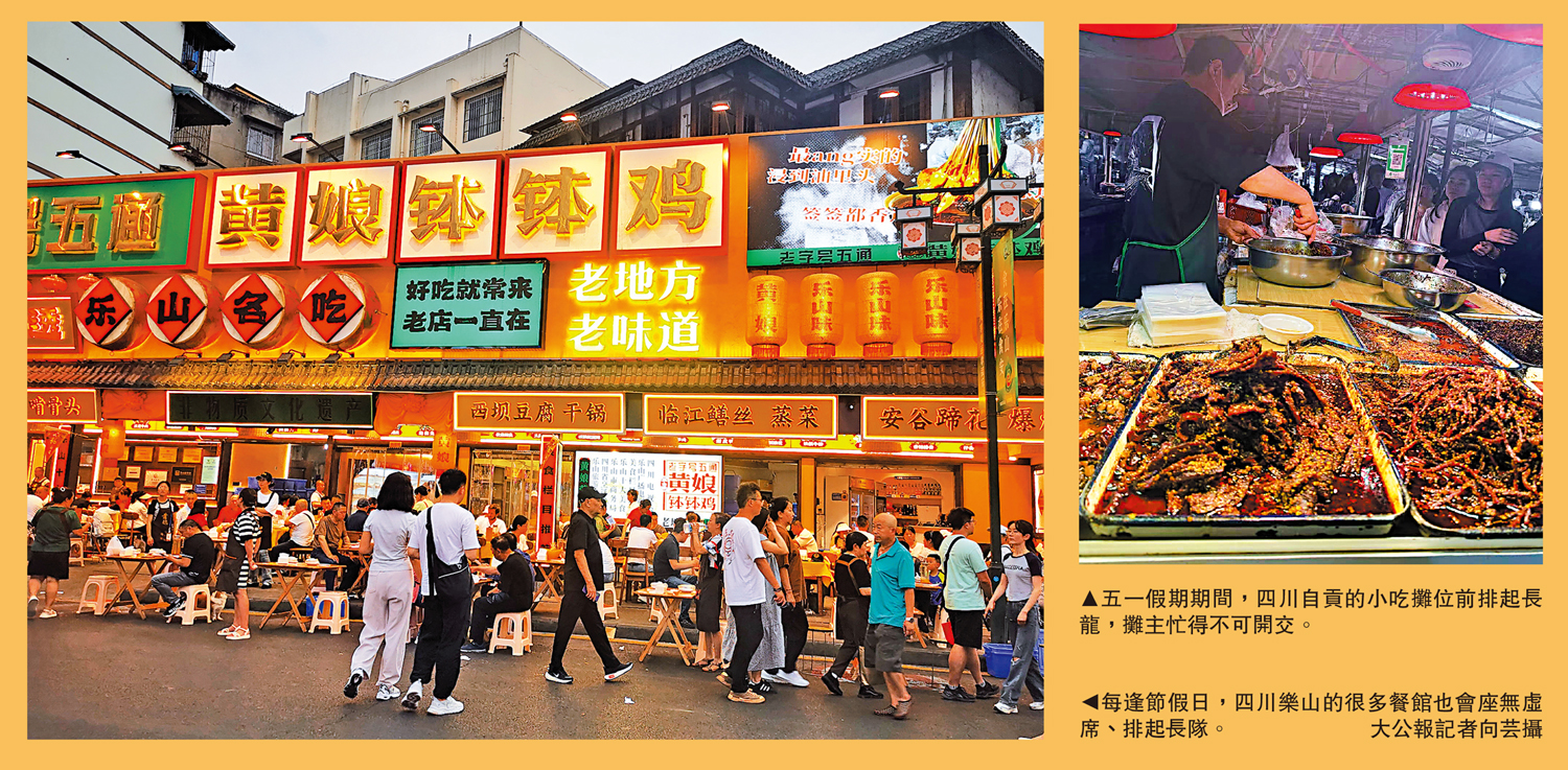 民以食為天,在「吃住行遊購娛」的旅遊六要素中,「吃」排在第一位。從去年山東淄博的燒烤,到今年甘肅天水的麻辣燙,美食成為遊客直觀感受當地民俗文化和市井生活的載體,像一點火星,點燃了各省市的文旅市場。「柳州螺螄粉,吃了;自貢冷吃兔,吃了……」今年「五一」假期,內地以品嘗特色美食、體驗美食文化為目的的新旅遊業態引人關注,可謂「舌尖上的五一,沒有一個城市是冷門」。「五一」假期第一天,大公報記者駕車前往四川省自貢市,與眾多「自駕族」一同開啟「鹽幫」美食之旅。食指大動之間,自貢的「食」足「味」力也呼之欲出,引得遊人驚呼,「你怎麼這麼好吃!」\大公報記者 向芸