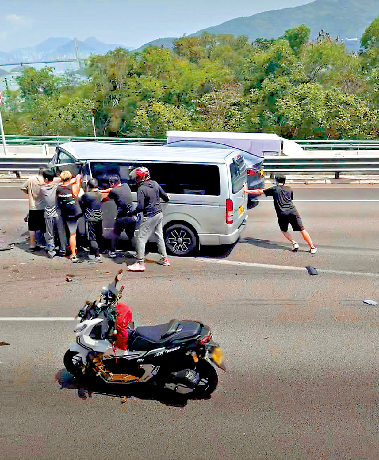 【大公報訊】屯門公路昨午2時許發生車禍,一輛貨車及一輛客貨車沿屯門公路往九龍方向行駛,駛至近大欖涌屯門公路轉車站時相撞,客貨車一名9歲男童受傷,女司機受傷一度被困,多名途經的熱心司機見義勇為,下車協助拯救被困女司機,亦有人在肇事的斜路「頂住」車尾以防客貨車溜後(圖)。兩人其後清醒送院治理。消息指,其中一輛車疑因故障停下,尾隨車輛疑收掣不及撞上前車,客貨車車頭嚴重損毀,碎片零件散落一地。受事故影響,上址路段部分行車線一度封閉至昨午約4時解封。