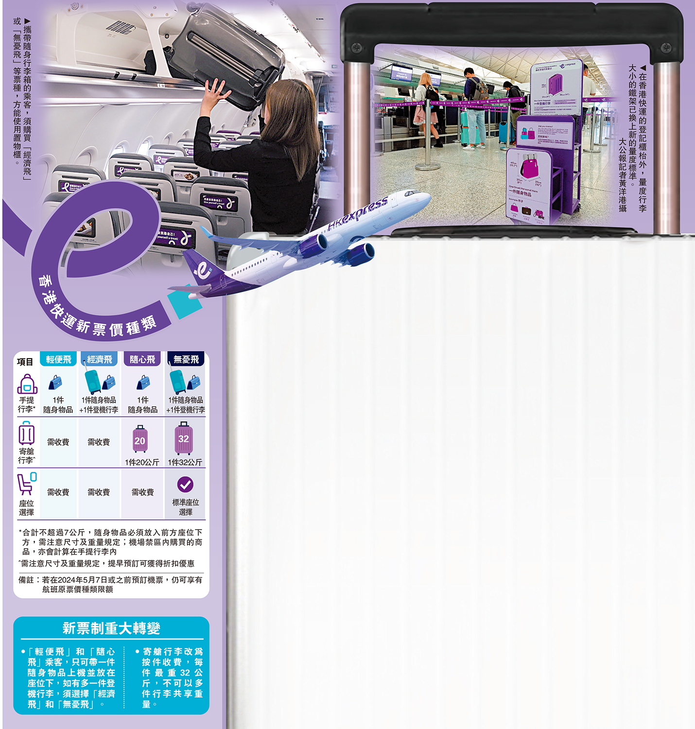 網上早前流傳,香港快運將更改行李收費標準,消息引起熱愛旅遊的港人熱議,擔心外遊開支因而增加。昨日香港快運宣布,即時實施新票價機制,以「為切合各路旅人旅程需要,我們為大家帶來更靈活、更有彈性的全新票價種類」作為宣傳。