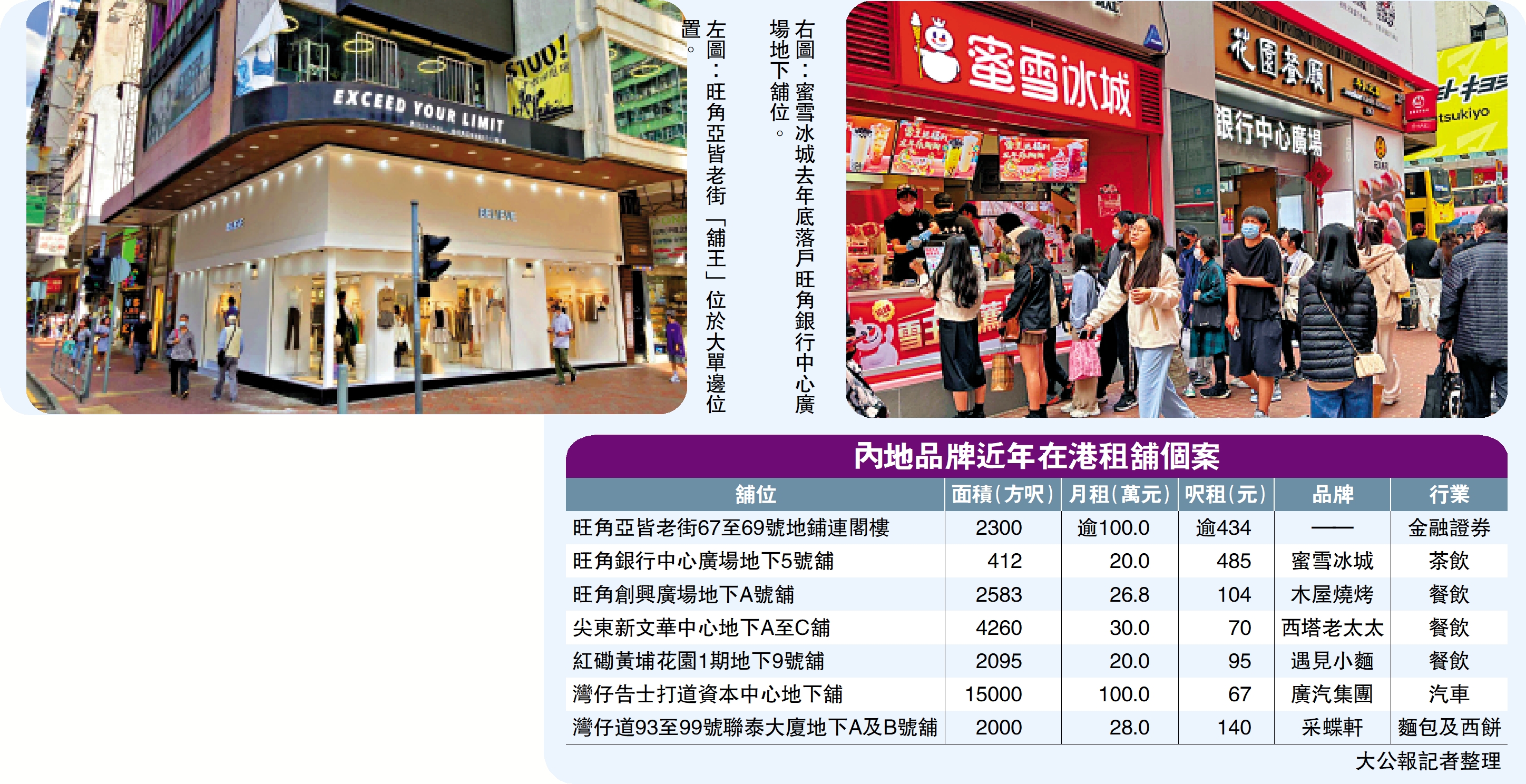 事實上,近年不乏內地品牌落戶香港,以餐飲行業最積極,過去一年多家內地人氣連鎖食店已來港大展拳腳,最矚目為太二酸菜魚,去年一口氣在沙田、尖沙咀、九龍塘及啟德連開4間分店,隨即掀起「北店南下」擴充熱潮,包括有「奶茶界拼多多」之稱的內地連鎖茶飲品牌「蜜雪冰城」,去年底以每月約20萬元承租旺角銀行中心廣場地下5號舖,面積約412方呎,呎租約485元。