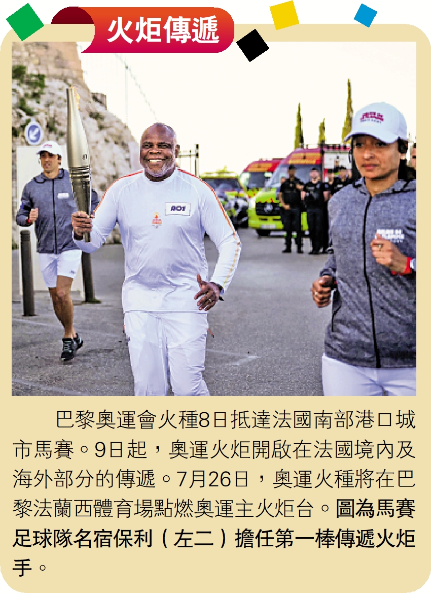 巴黎奧運會火種8日抵達法國南部港口城市馬賽。9日起,奧運火炬開啟在法國境內及海外部分的傳遞。7月26日,奧運火種將在巴黎法蘭西體育場點燃奧運主火炬台。圖為馬賽足球隊名宿保利(左二)擔任第一棒傳遞火炬手。