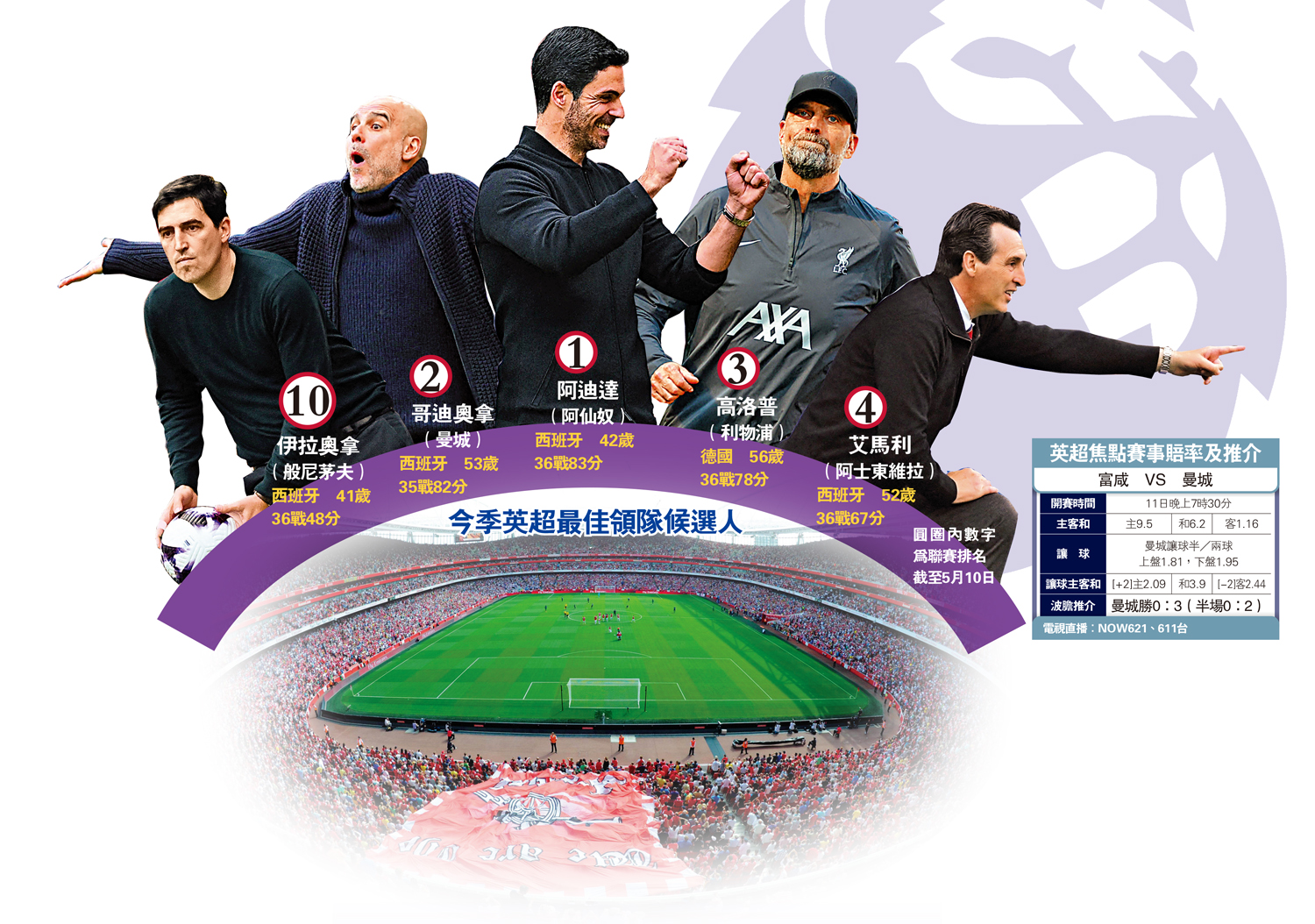 英超官方日前公布今季最佳領隊候選名單,5人之中,包括三位聯賽前四位的三位西班牙籍主帥都入圍,包括曼城的哥迪奧拿、阿仙奴阿迪達、阿士東維拉艾馬利及暫列第10般尼茅夫伊拉奧拿,前兩者延續上季兩頭馬車爭標激鬥,後兩人就帶領球隊表現有長足進步,取得突破性佳績,與此同時據報前西班牙國家隊教練盧比迪古已答應接掌韋斯咸帥印,還有基羅納的米曹和巴黎聖日耳門的安歷基,或遲或早亦有機會前來,未來幾年的英超,極可能由西班牙主帥支配。\大公報記者 譚德龍