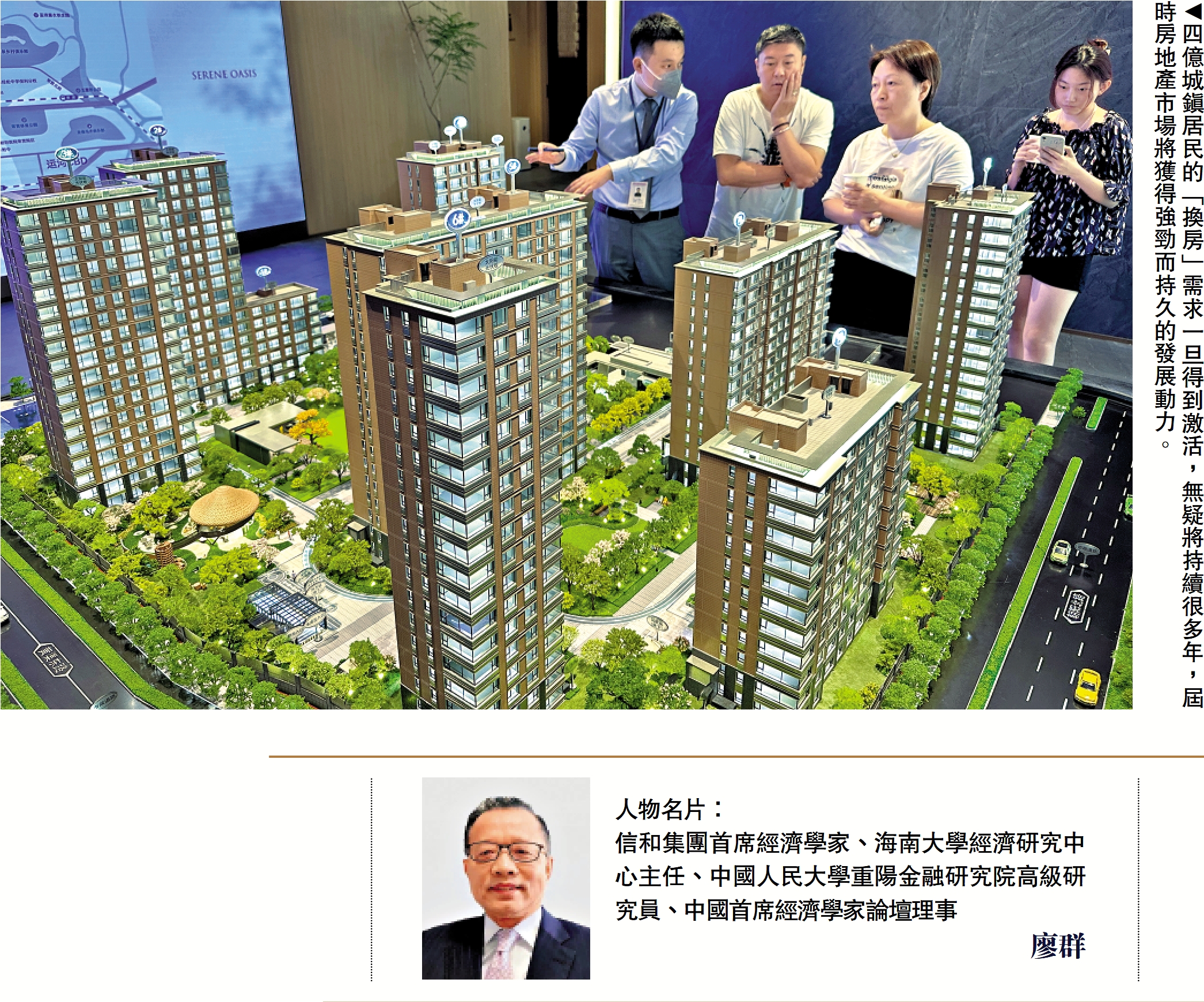 在廖群眼中,「城中村」改造,是典型的住房標準升級,惟其所涉規模尚且不大,未來更需要激活4億仍居住於非商品住房中的城鎮居民的「換房」需求。另一方面,房地產領域也應與其他行業一樣同步開展標準升級,藉此形成全國性的,由城鎮居民「換房」推動的住房標準升級熱潮。