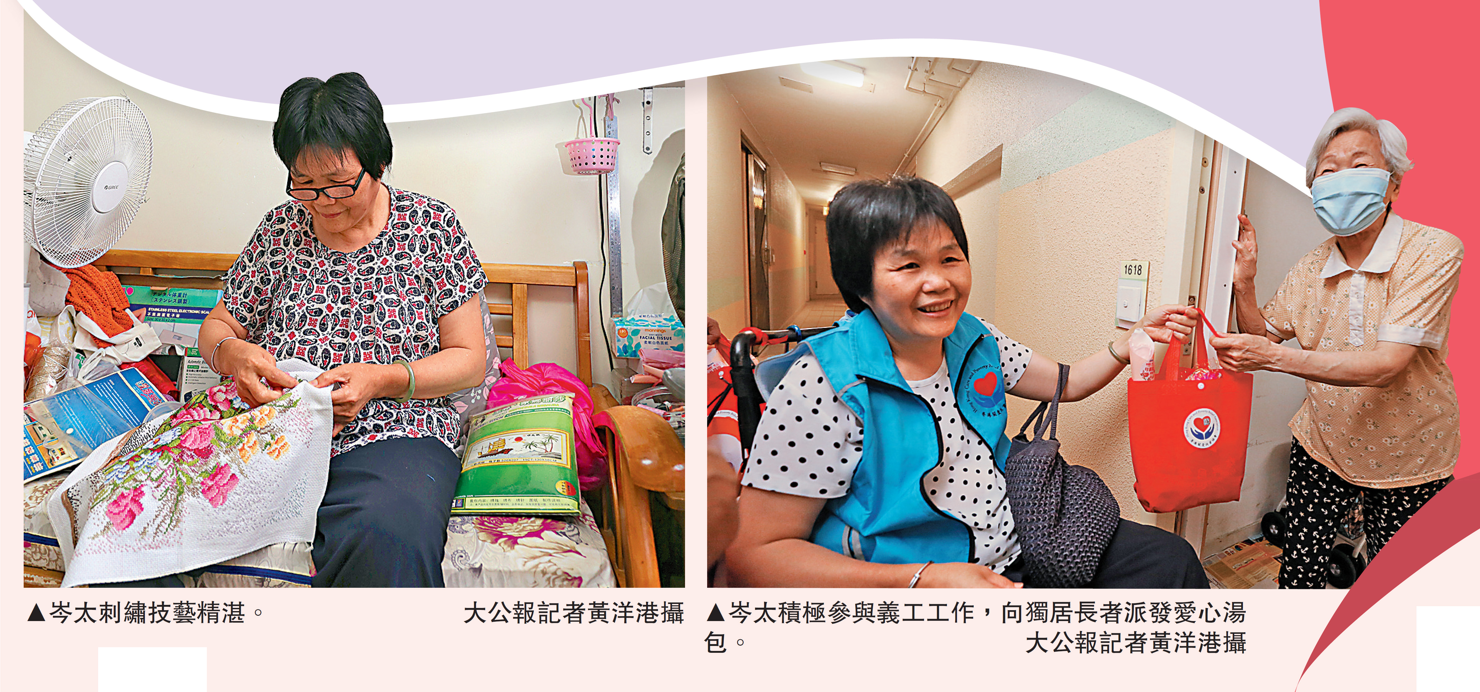 雖然下肢殘疾,但岑太的手工非常巧,刺繡畫相當出色。記者在她家中訪問時,一直以為牆上那近兩米寬的《八駿圖》是買回來的,卻原來是她一針一線繡出來。為幫補家計,她閒時在家做刺繡畫,一針一線,花的時間難以估量,「試過有人花上萬元買我的畫,但是繡了半年,幾乎所有時間都花在上面了。」能用雙手賺錢買兒子喜歡的東西,岑太說覺得辛勞還是有價值。