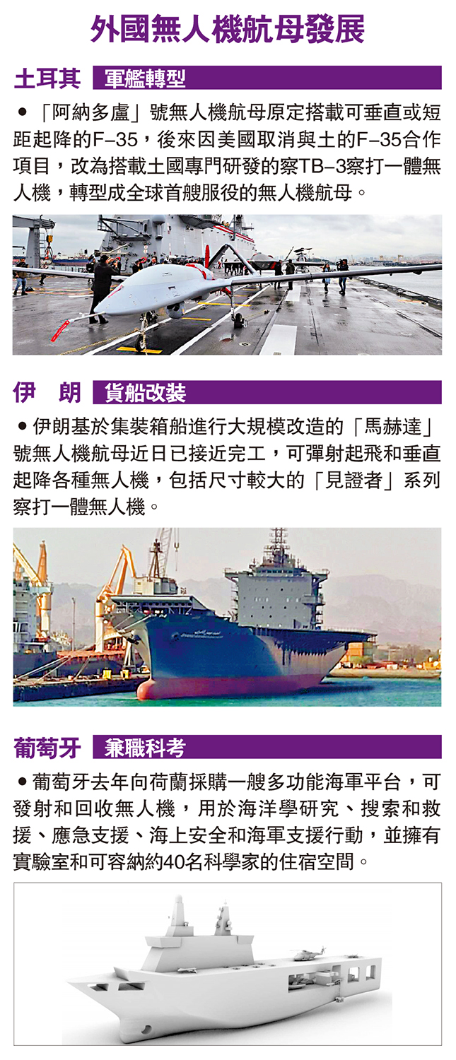 •「阿納多盧」號無人機航母原定搭載可垂直或短距起降的F-35,後來因美國取消與土的F-35合作項目,改為搭載土國專門研發的察TB-3察打一體無人機,轉型成全球首艘服役的無人機航母。