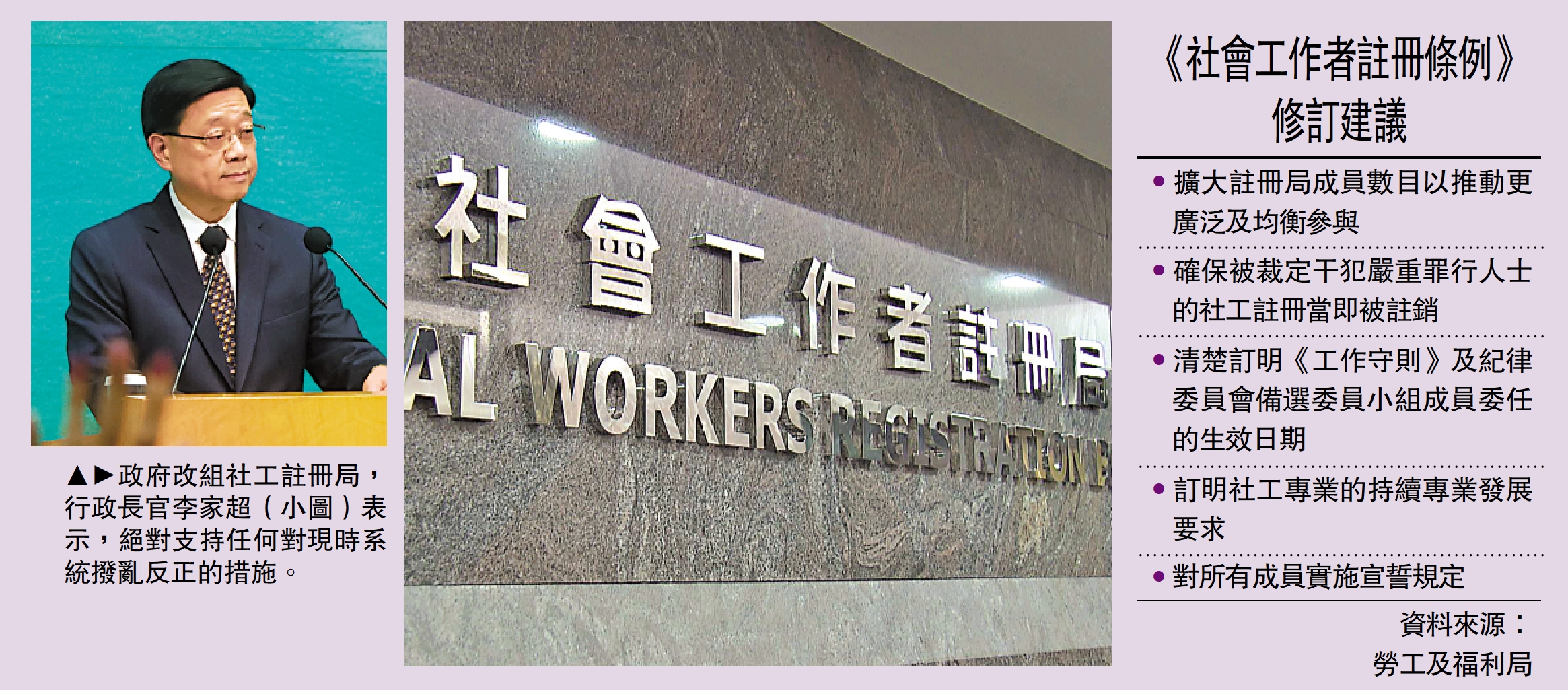 行政長官李家超表示,絕對支持在現時系統上需要撥亂反正,矯正系統不完善的任何措施,他有信心勞工及福利局在相關方面有充分認識和掌握,認為局方會適當處理事件。勞工及福利局局長孫玉菡表示,現時的註冊局過於偏頗,未有顧及社會整體利益,認為改組可令註冊局「重回正軌」,為社工專業發展提供好基礎。他強調,註冊局要行使公權力,要求成員宣誓是理所當然。\大公報記者 易曉彤