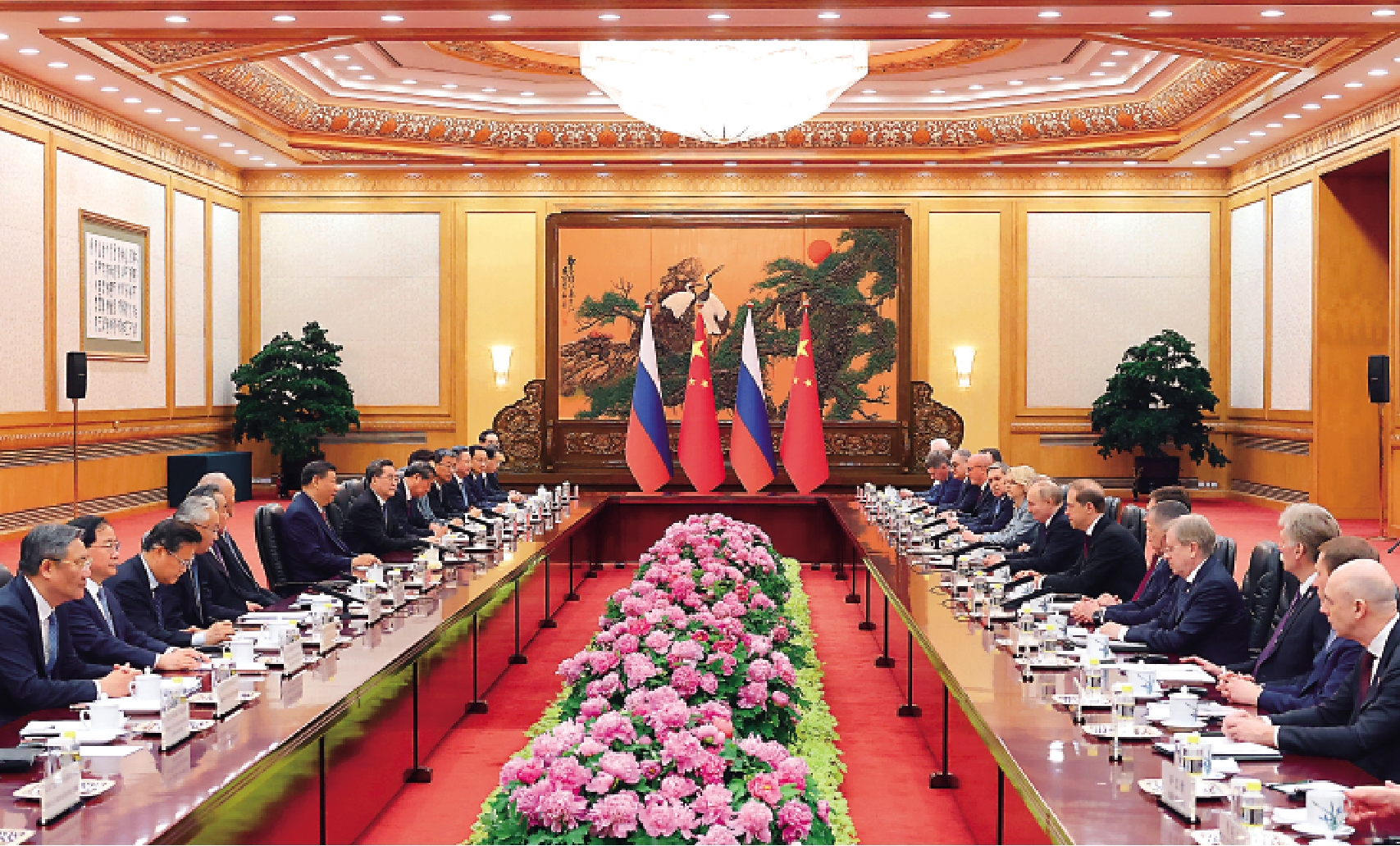 普京表示,我很高興在就任新一屆俄羅斯總統後再次訪華。去年3月習近平主席也在連任後不久即對俄進行國事訪問。這是我們兩國的友好傳統,表明雙方對加強新時代俄中全面戰略協作夥伴關係的高度重視。今年是中華人民共和國成立75周年,也是俄中建交75周年,值得我們共同慶祝。發展俄中關係不是權宜之計,不針對第三方,有利於國際戰略穩定。俄方願同中方持續擴大雙邊合作,密切在聯合國、金磚國家、上海合作組織等框架內溝通協作,推動建立更加公正合理的國際秩序。