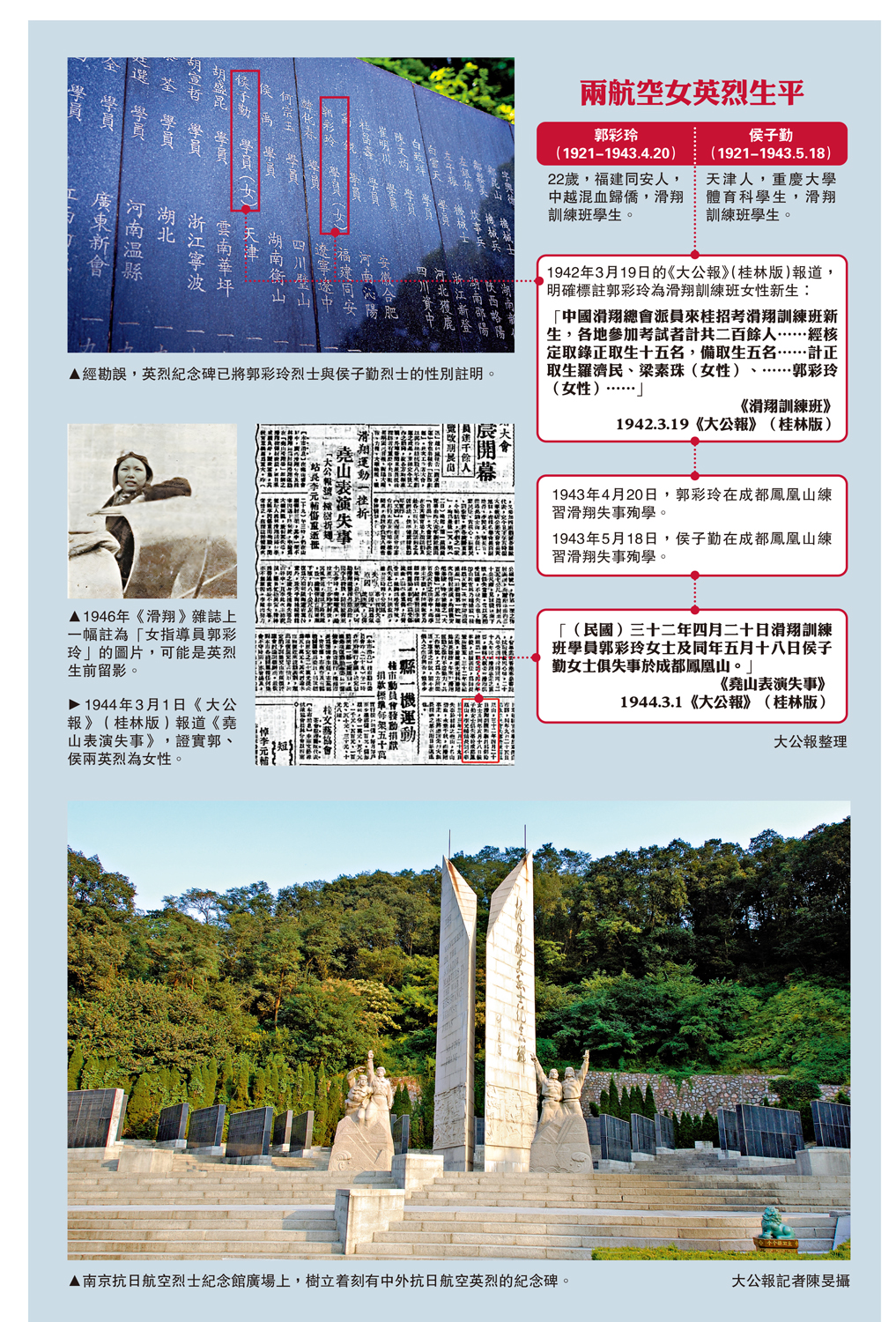 而在查找郭彩玲身份過程中,另一位抗日航空英烈的性別也通過《大公報》的報道得以確認。1944年3月1日的《大公報》(桂林版)《堯山表演失事》一文記錄:「(民國)三十二年四月二十日滑翔訓練班學員郭彩玲女士及同年五月十八日侯子勤女士俱失事於成都鳳凰山。」廈門媒體將這篇史料發往南京抗日航空烈士紀念館後,紀念館回函表示:「我館基本可以確認重慶大學體育科學生侯子勤為英烈碑上發現的第三位女航空英烈。」據了解,侯子勤為天津人,和郭彩玲同屬參加滑翔訓練時失事犧牲,至此,航空烈士公墓英烈碑上中國抗日航空女英烈增至3人。