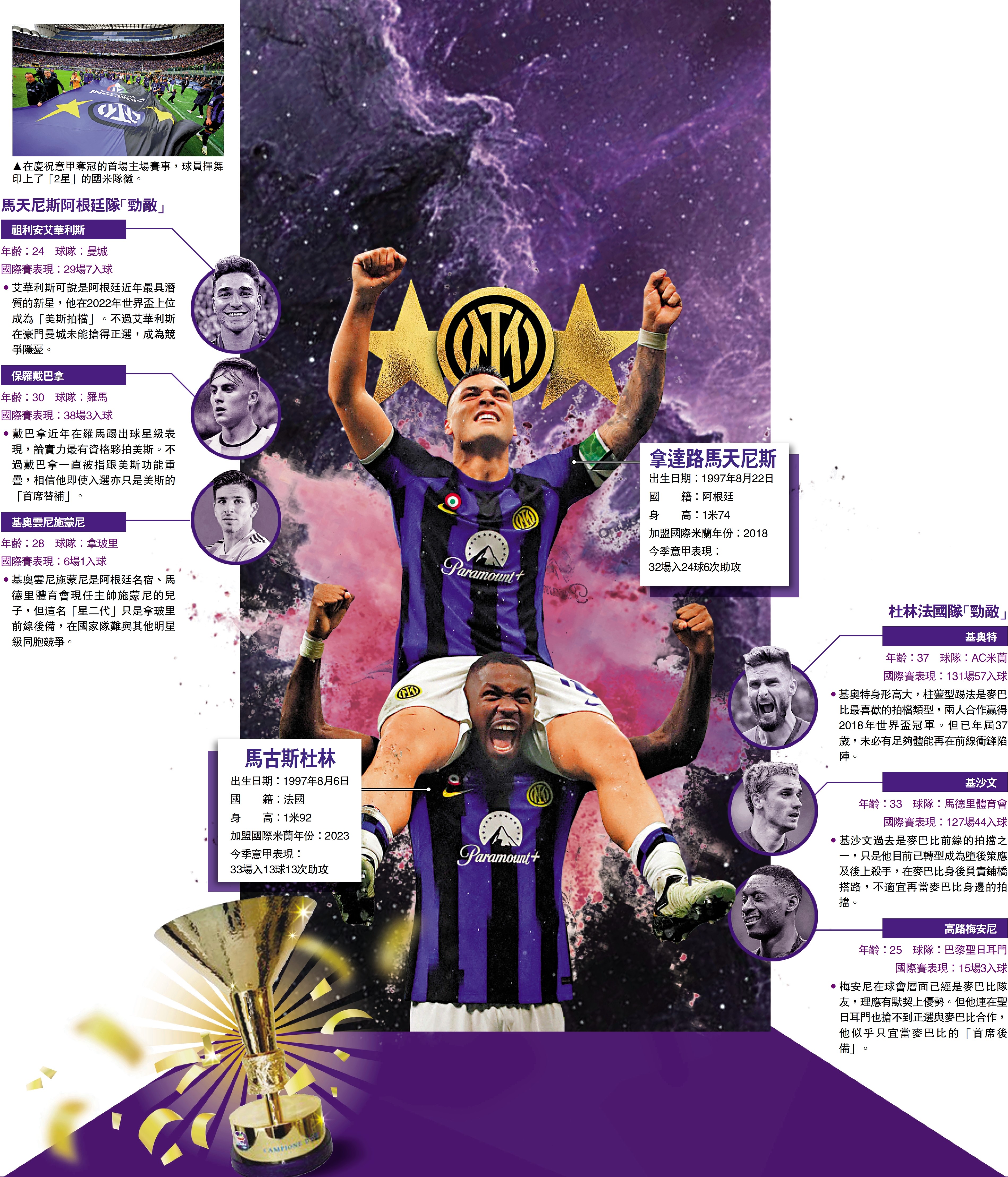國際米蘭勇奪今季意甲冠軍,是球隊史上第20次封王,來季隊徽上亦將由一星(代表10次冠軍)增至兩星。一對箭頭拿達路馬天尼斯及馬古斯杜林被視為頭號功臣,這對前鋒拍檔是場內場外的真老友,容易建立默契。二人下一個目標,是爭取將勇態延續至國家隊,各自在美洲國家盃與歐洲國家盃,成為「王者的拍檔」。馬天尼斯期望以阿根廷隊正選身份輔助美斯衛冕美洲盃,杜林則力爭夥拍法國星將基利安麥巴比首奪歐國盃。\大公報記者 梁潤森