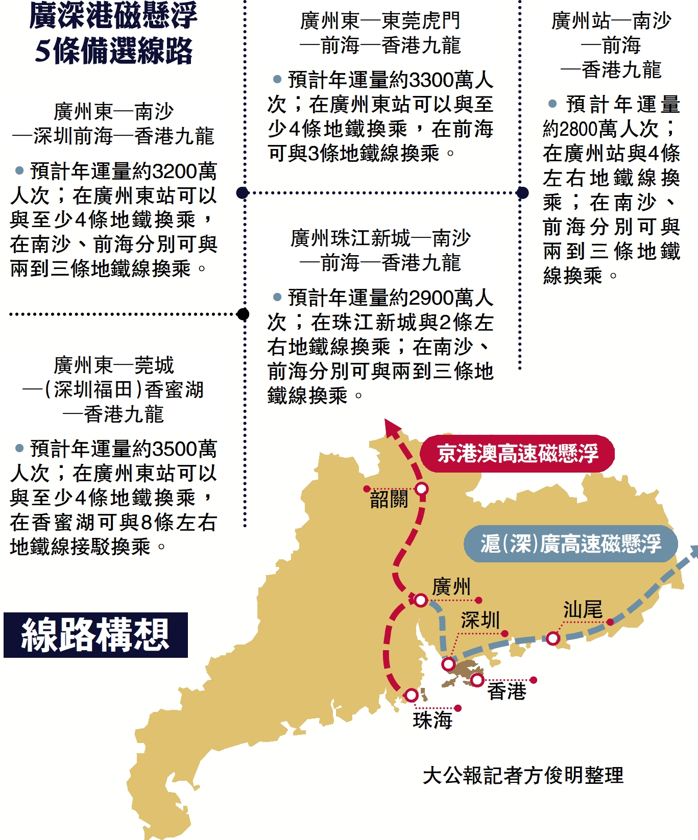 •預計年運量約2800萬人次;在廣州站與4條左右地鐵線換乘;在南沙、前海分別可與兩到三條地鐵線換乘。