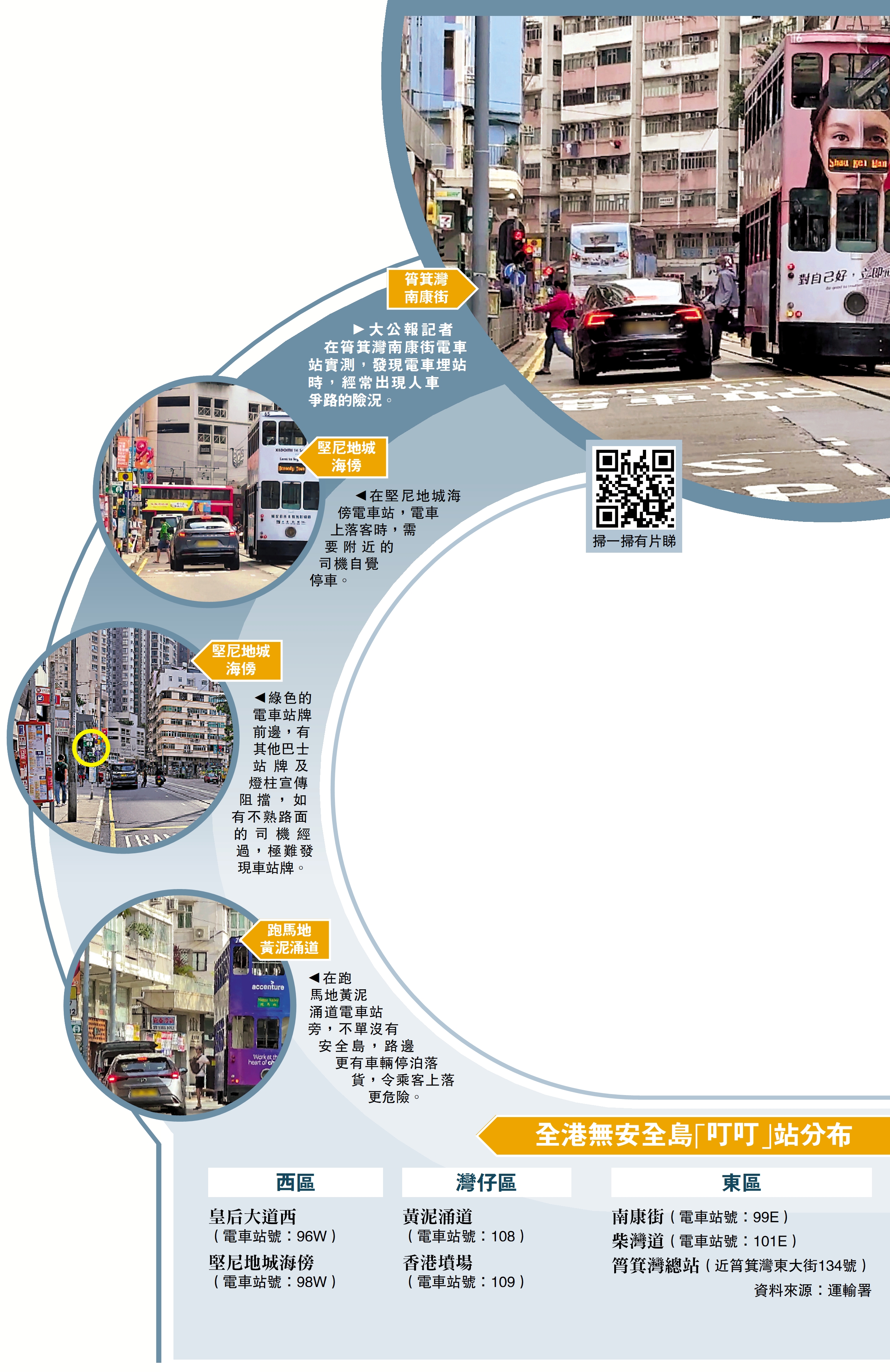 俗稱「叮叮」的香港電車,是本港有逾120年歷史的交通工具,惟部分電車站並沒有安全島,乘客上落時「搵命博」。大公報記者日前走訪全港多個電車站,發現該些沒有安全島的電車站,經常出現乘客一邊上落電車,一邊有車輛在旁邊擦身而過的驚險場面。