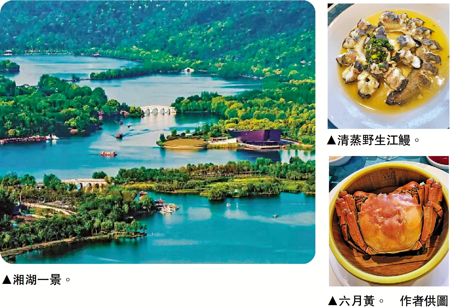 午宴設在湘湖邊跨湖樓,湖光山色襯人間美食。先嘗精美六小碟,熱菜是當地湖江鮮:堂灼江蝦、紅燒錢塘江米魚、野生鱸魚兩吃(骨熬濃湯、陳皮蒸魚肉)、六月黃湖蟹、清蒸野生江鰻、清蒸本塘野生甲魚、火腿蒸小水鴨配米飯、土豬肉燒毛筍、鹽水花蠶豆、石鍋臭乾、鹹肉蛋餃蒸豆瓣、蟶子筍乾燒絲瓜、清炒時令莧菜。烹調並無花巧,吃的是鮮上鮮,如此美景美食,怪不得養出西施這般佳人,更明白范蠡為何辭官歸湖,夫復何求。