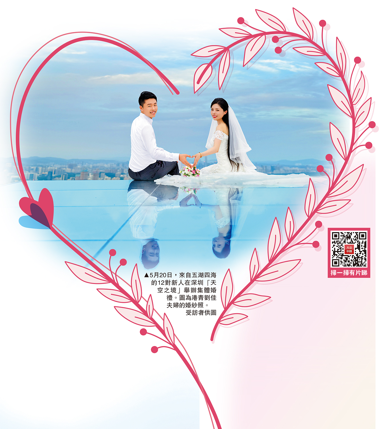 在諧音「我愛你」的520的日子裏,在深圳最高的露天觀景平台上舉辦婚禮,浪漫而意義非凡。5月20日,曾獲中國外交官華春瑩專門發文點讚、驚艷全世界千萬網友的深圳灣超級總部基地深灣睿雲中心80層「天空之境」,首次對市民開放。來自五湖四海、包括港青在內的12對新人,在深圳相識相戀,並從此攜手走進婚姻的殿堂。新人們或穿婚紗西裝,或是龍鳳褂,在「天空之境」幸福地完成了人生大事。一對港青夫婦說:「參與集體婚禮,是給我們倆一個儀式感,開啟即將到來的10年新篇章。」\大公報記者 胡永愛