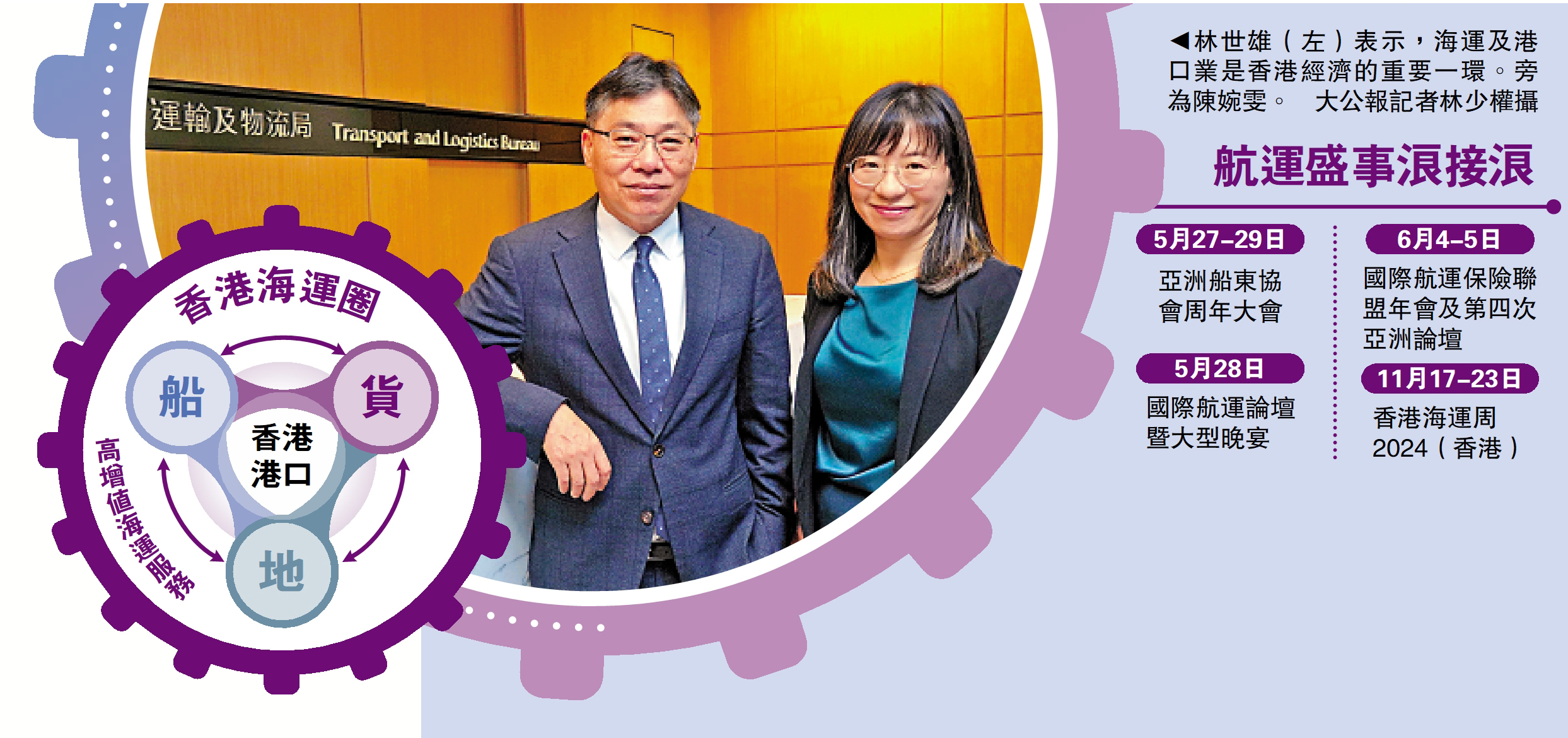 對於近年香港港口吞吐量下跌,香港運輸及物流局局長林世雄表示,海運及港口業是香港經濟的重要一環,「絕對不會放棄(港口),也不會放軟手腳,會在綠色和智能化兩方面提升競爭力。」同時也會繼續大力拓展高增值航運服務業,與港口雙線發展。\大公報記者 林靜文