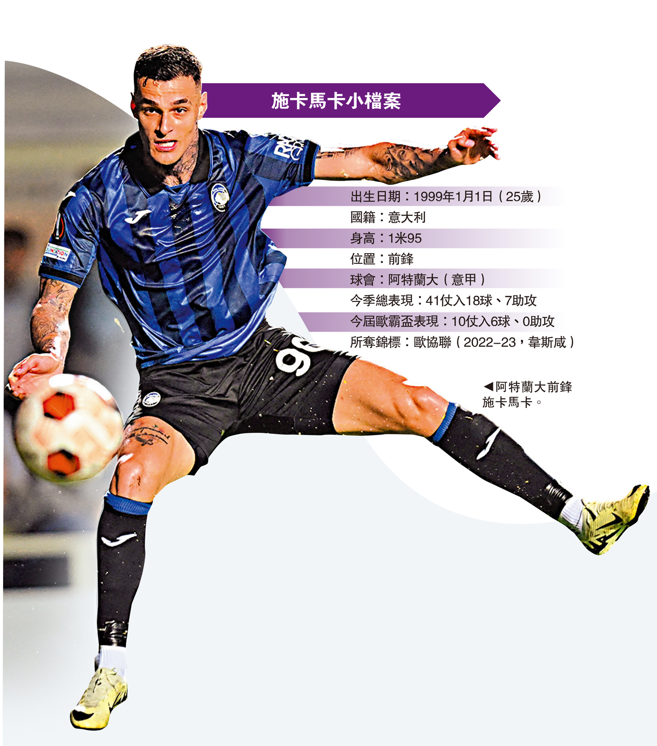 阿特蘭大前鋒施卡馬卡近1年欠了「決賽命」,上季效力英超韋斯咸時因傷而錯過歐協聯決賽,到上周的意大利盃決賽,他又因被罰停賽而缺陣,偏偏踏入季尾階段這名意大利國腳狀態大勇,4月份以來在11場上陣賽事,合共貢獻了8入球和4助攻,如今終於可以「無傷無停」於明晨歐霸盃決賽候命,他亦誓以大順腳風助球隊一舉打破對手利華古遜全季不敗之身,兼替阿特蘭大拿下隊史首個歐洲賽錦標。\大公報記者 譚德龍