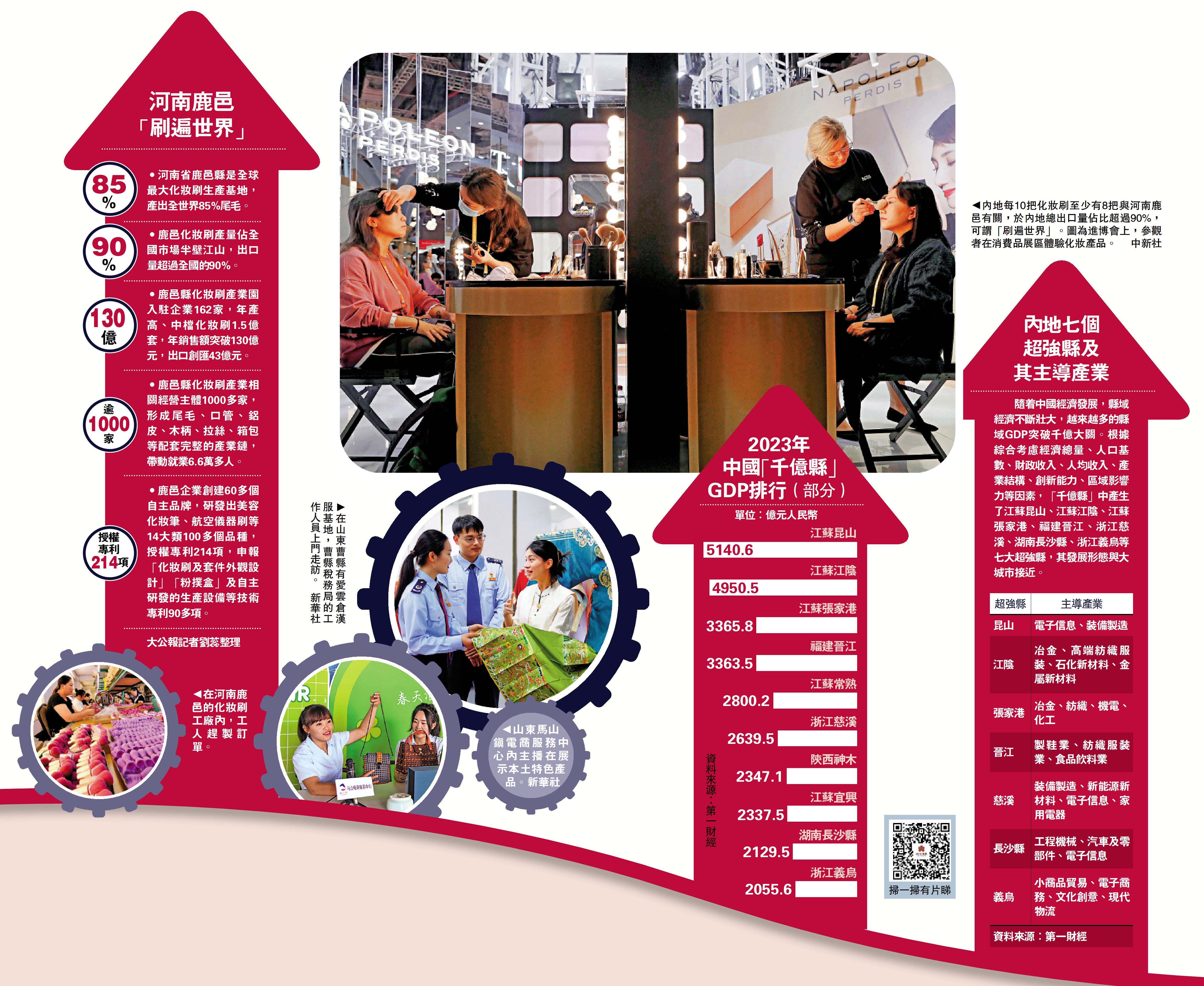 在河南鹿邑,曾被當作廢物丟棄的羊尾毛,孕育出國際美妝領域舉足輕重的化妝刷產業。內地每10把化妝刷至少有8把與河南鹿邑有關,於內地總出口量佔比超過90%,「刷遍世界」,雅詩蘭黛、香奈兒這種國際大牌的化妝刷跟鹿邑有關,全縣化妝刷產業鏈年銷售額突破130億元(人民幣,下同)。當傳統產業注入創新力量,也能「老樹發新枝」,形成新活力。一縣一業,百業競發,充滿韌性的縣域經濟正展現其巨大的增長潛力、發展活力,成為推動我國經濟高質量發展一股澎湃力量。\大公報記者 劉蕊