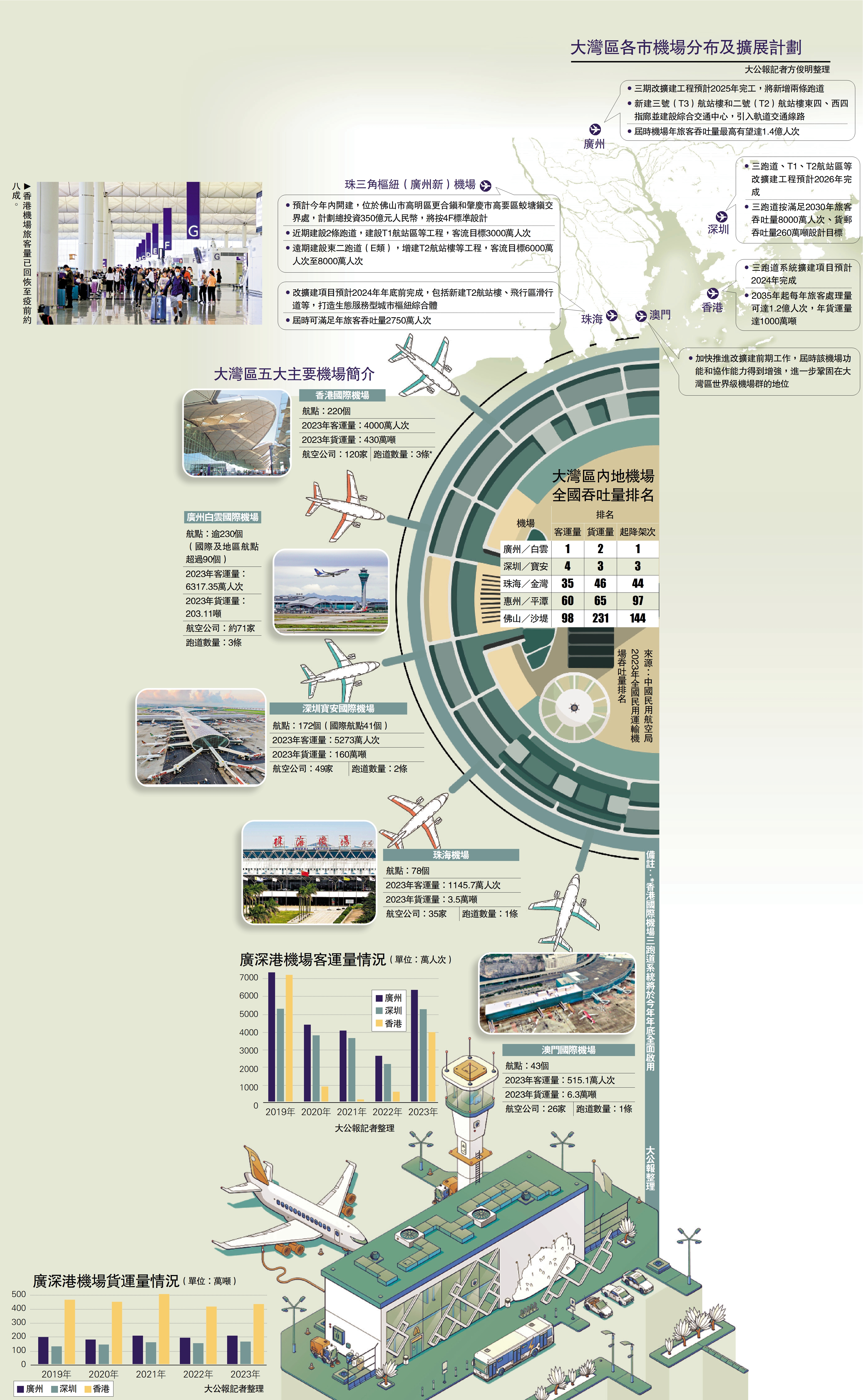 為迎接未來的大量需求,大灣區內各大機場均在擴容建設。其中,香港國際機場三跑道系統目標今年年底啟用,於2035年起每年處理客貨運量分別達1.2億人次和1000萬公噸。另隨着海天中轉大樓去年開幕,加上正建設的SKYCITY航天城,香港國際機場的機場城市藍圖逐漸成形。